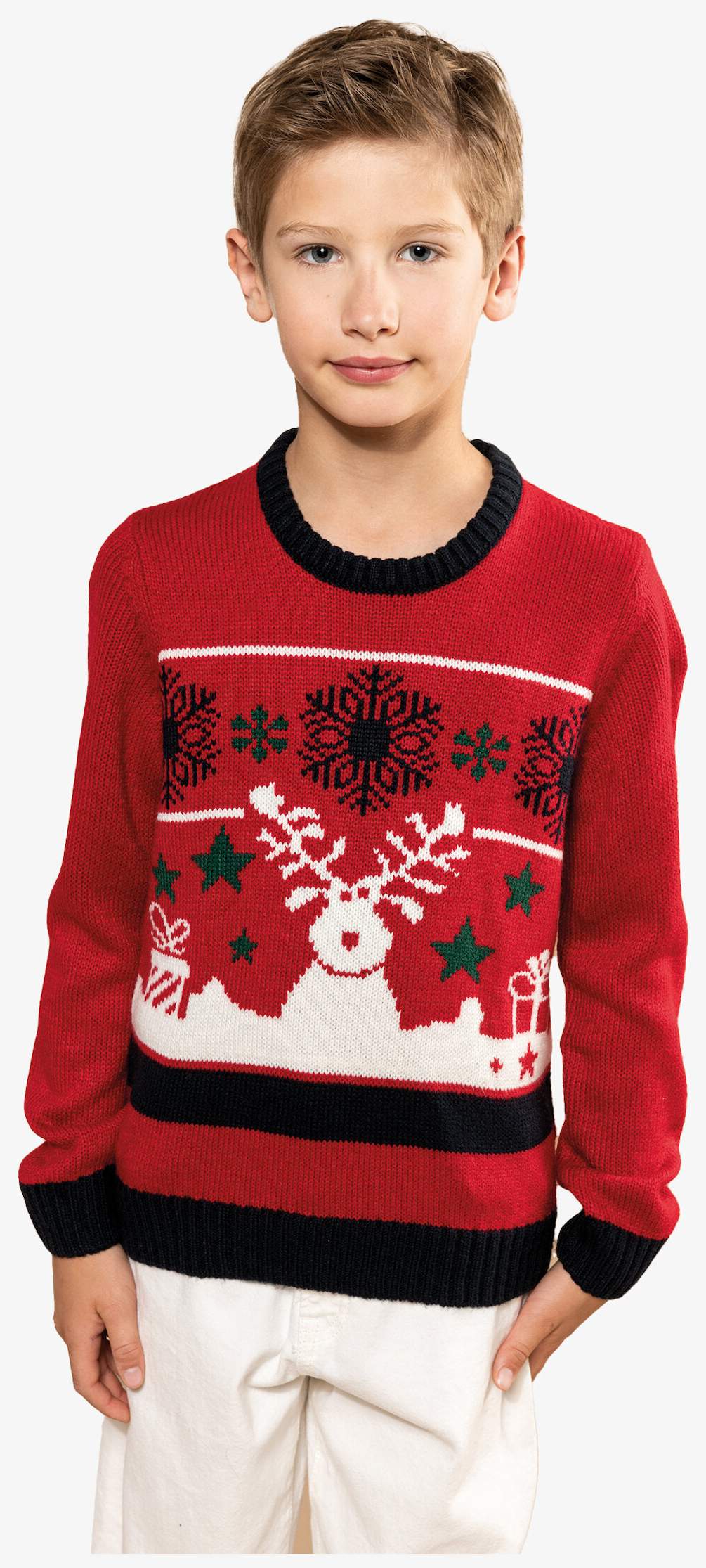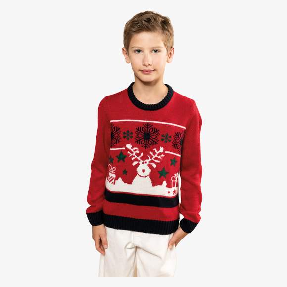 Pulower z okrągłym dekoltem na Boże Narodzenie dla dzieci jest dziany fully fashion z dopasowanym krojem i 5 gauge. Posiada wzory bożonarodzeniowe w dzianinie intarsia na przodzie. Okrągły dekolt i kontrastowe wykończenia ściągacza 2x2 znajdują się na kołnierzu, mankietach i dole ubrania. Pasek wzmacniający w tonacji z kolorem głównym. Ściągacz zawiera elastan, aby ograniczyć odkształcenia. Znacznik rozmiaru zastępuje metkę na kołnierzu.