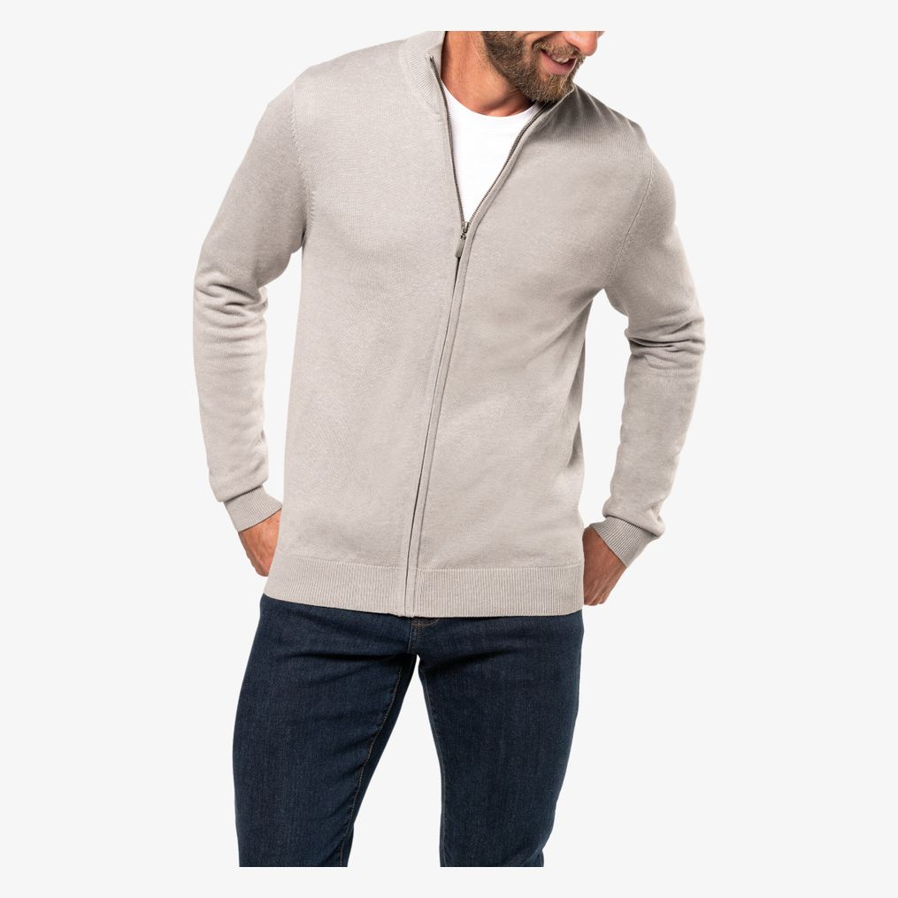cardigan zippé homme k961 to dopasowany sweter z podwójnym kołnierzem kominowym i zamknięciem na suwak z przydymionego metalu. Taśma wzmacniająca przy dekolcie.