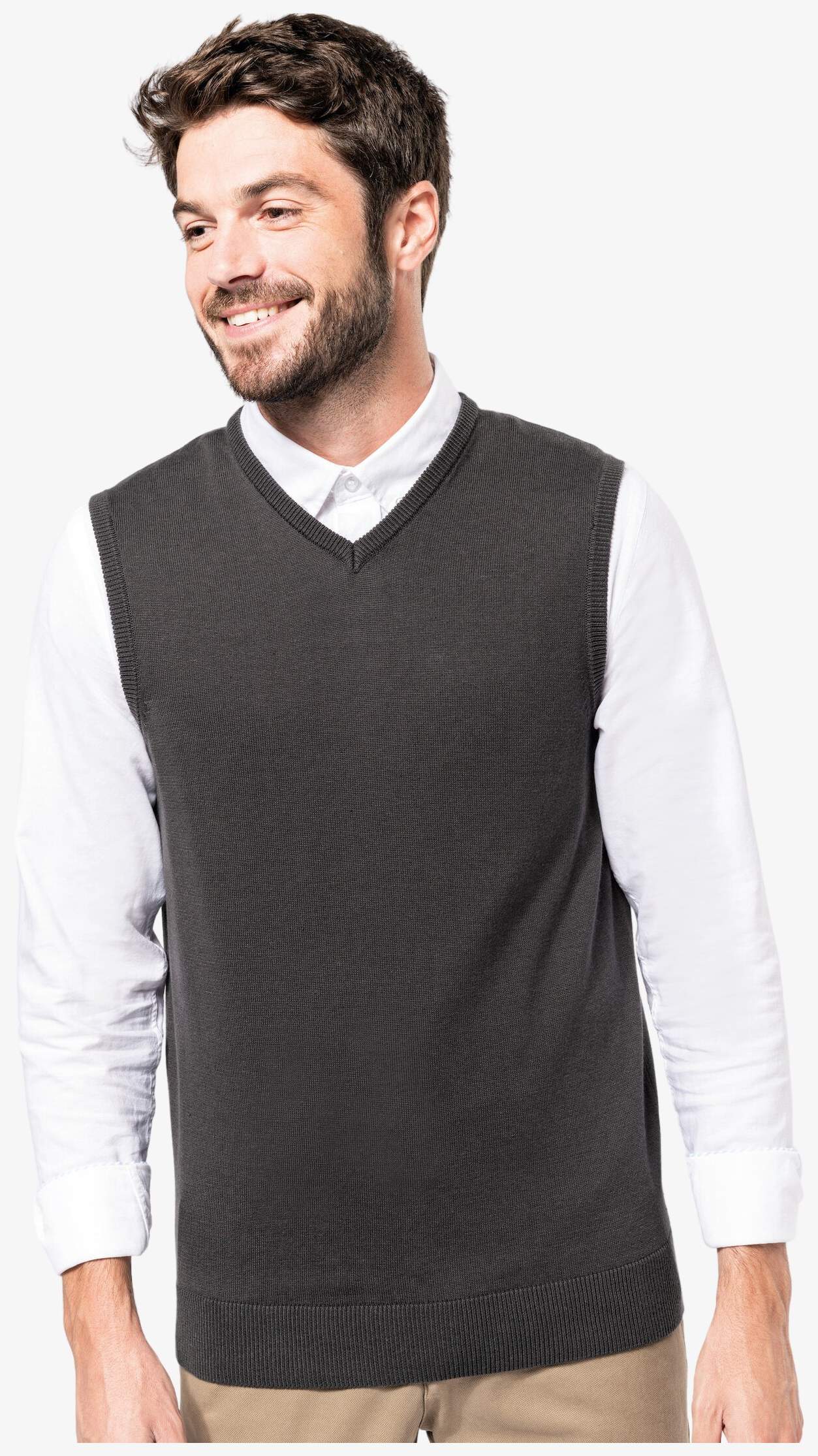 Pull col V sans manches z dzianiny 50% bawełna / 50% akryl o dopasowanym kroju. Dekolt V i pachy wykończone podwójnym ściegaczem, taśma wzmacniająca przy dekolcie.
