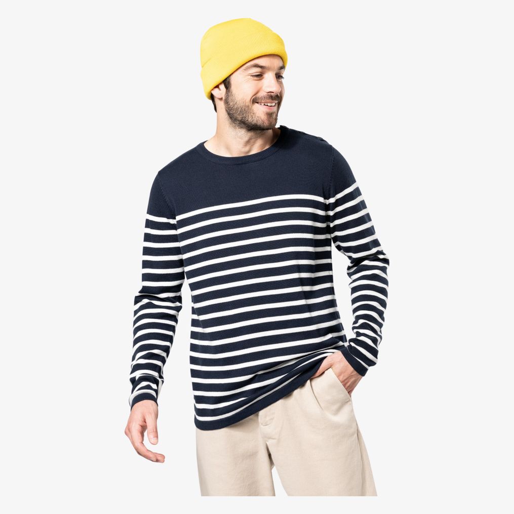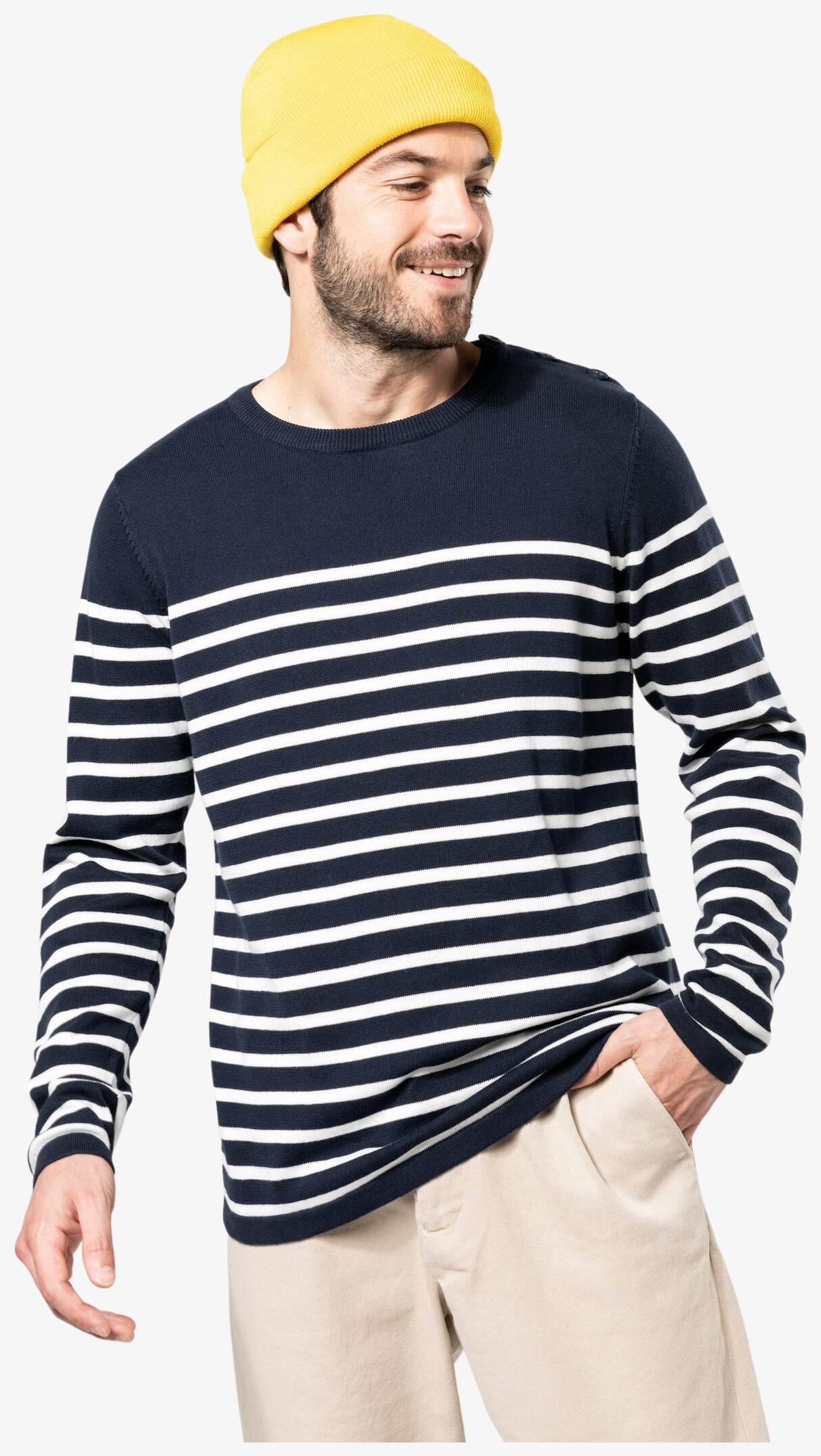 Sweter marynarski z bawełny posiada otwarcie na lewe ramię z trzema guzikami w kolorze. Dekolt wykończony ściągaczem 1 x 1. Rękawy wykonane z podwójnie dzianej dzianiny.