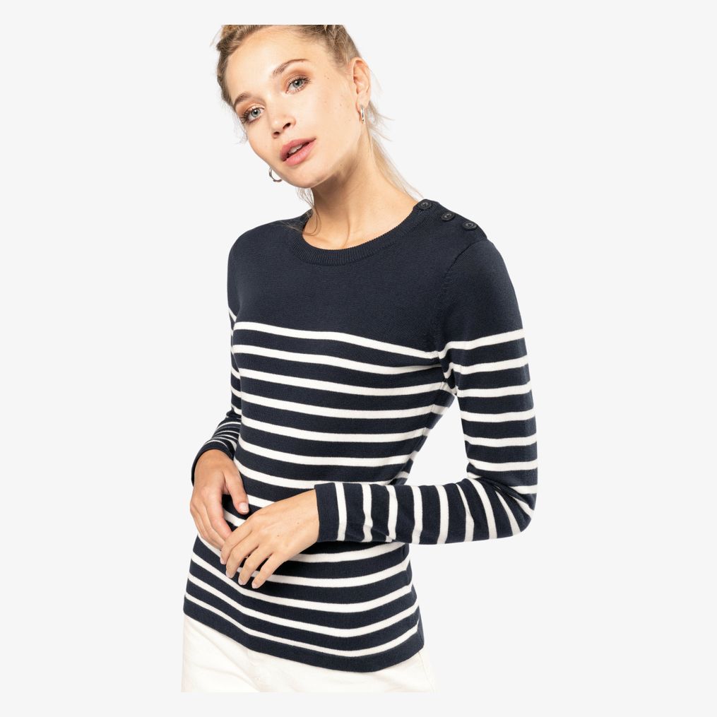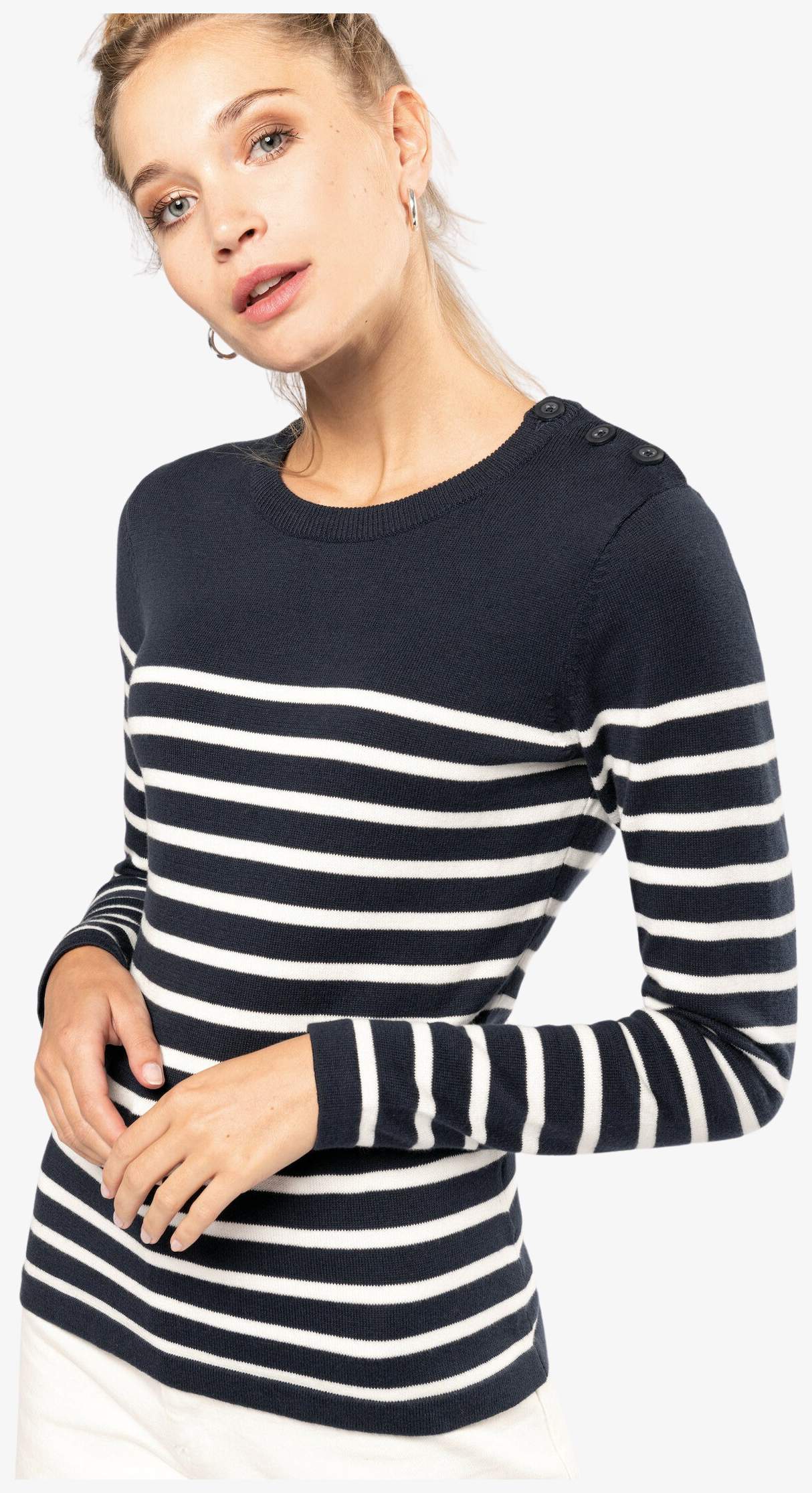 pull marin femme k990 wykonany jest w 100% z bawełny o włóknie 12. Posiada otwarcie na lewym ramieniu z 3 guzikami w tonacji oraz ściągacz 1 x 1 przy dekolcie. Dół rękawów i ubrania wykonany jest z podwójnej dzianiny.