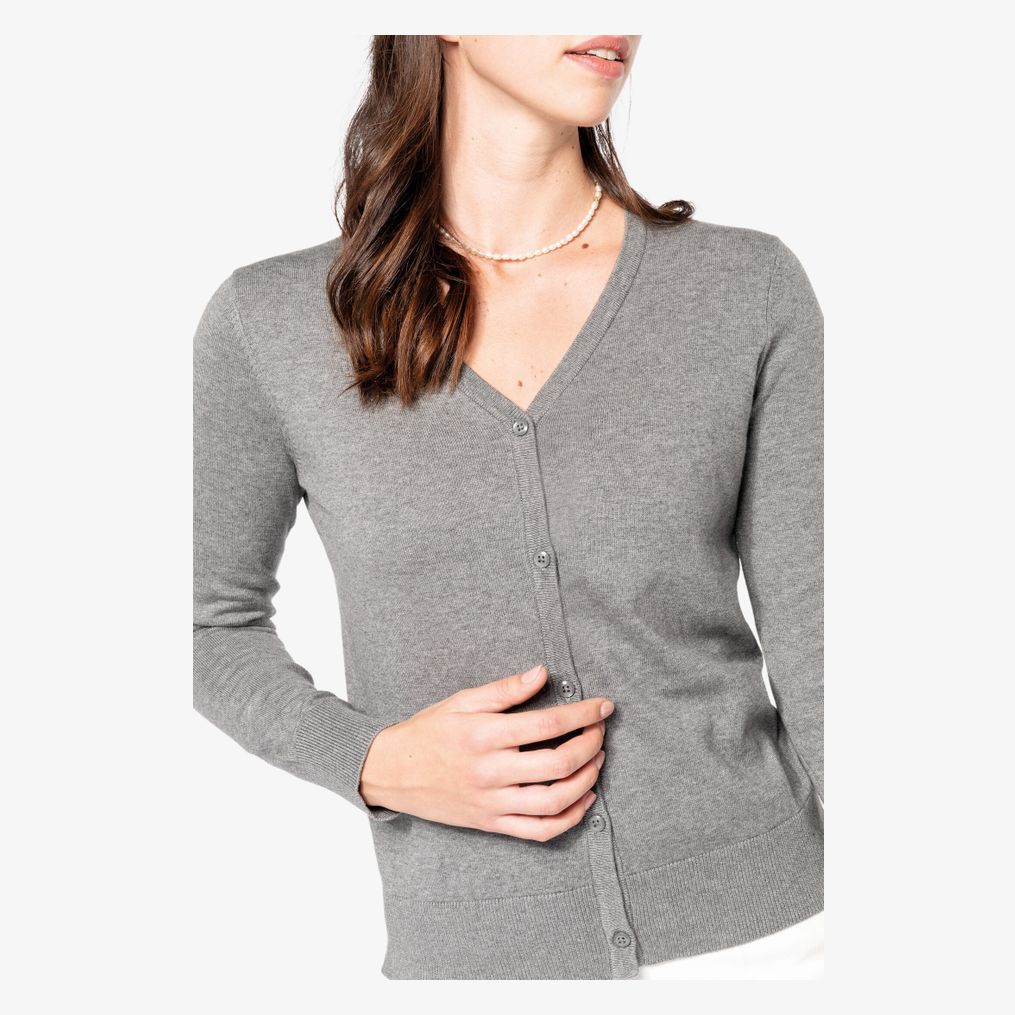 cardigan Supima® femme wykonany z bawełny czesanej o rozmiarze oczek 12. Dzianina fully-fashioned, składana na maszynie zszywającej. Dekolt, mankiety i dół ubrania wykonane ze ściągacza 1x1. Guziki plastikowe ton w ton.