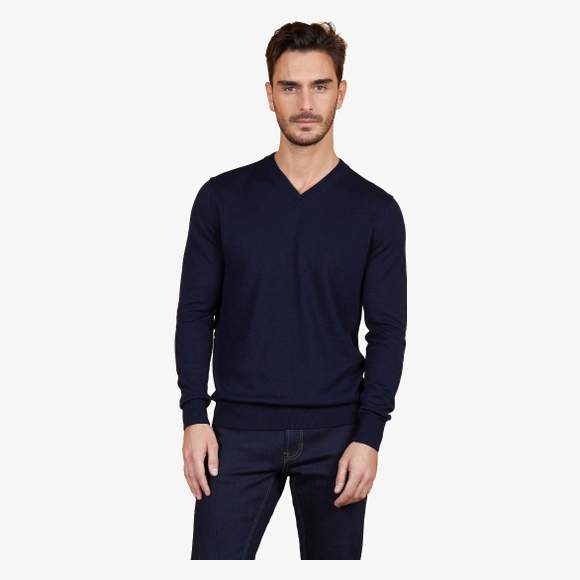 Męski sweter z dekoltem w słupek ma nowoczesny krój z dekoltem i mankietami w ściągaczu 1x1 oraz wszycia ze zmniejszeniem. Skład to dzianina o gęstości 14 z 50% wełny merino RWS i 50% poliestru z recyklingu.