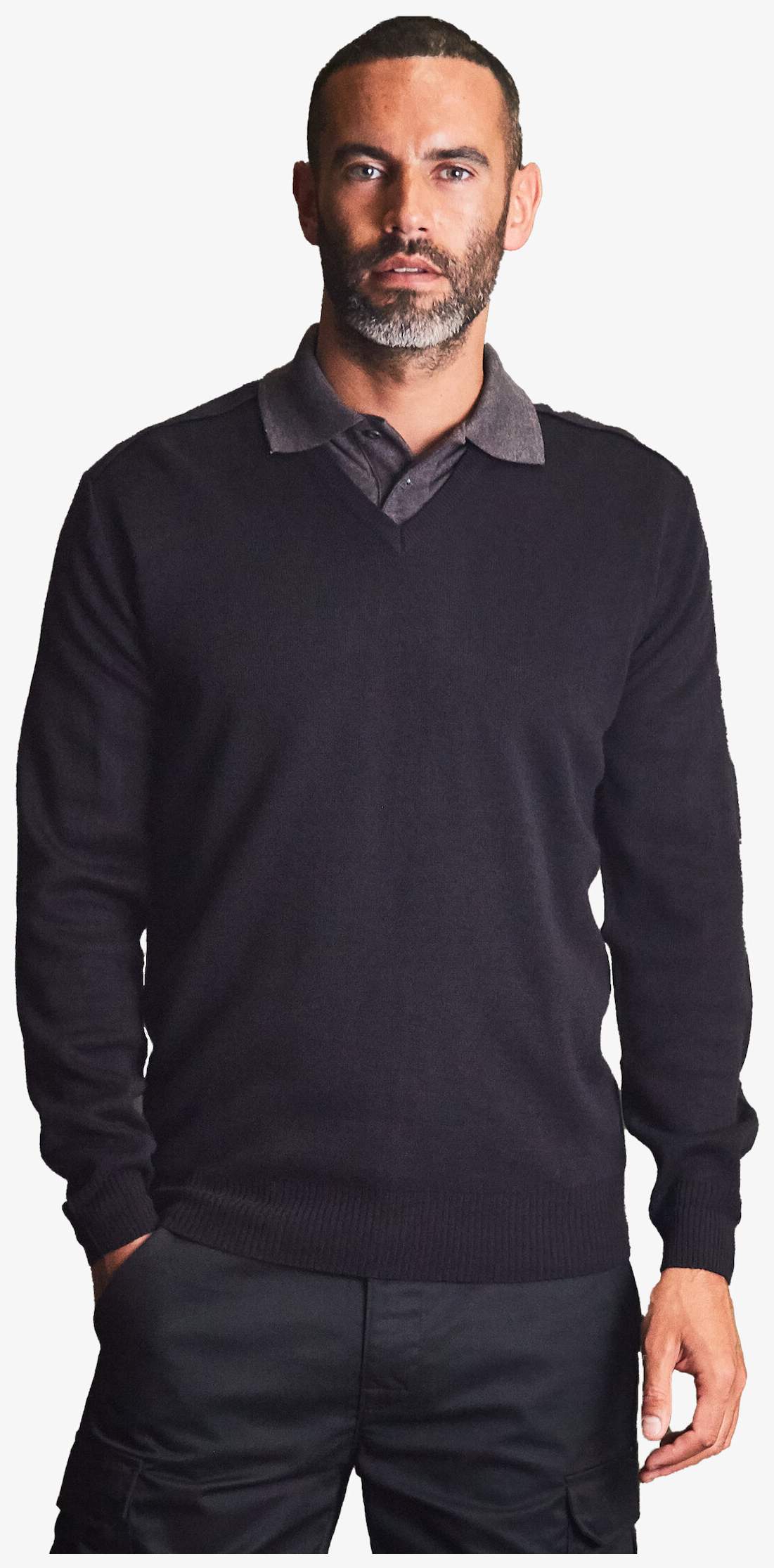 Pro Sweater to sweter z dekoltem w serek z naszytymi rękawami i rękawem w kształcie młotka. Kołnierz i mankiety są wykonane z prążkowanego dzianego materiału z zakończeniem w szpic. Krój jest uniseksowy i nowoczesny. Skład to 100% akryl.