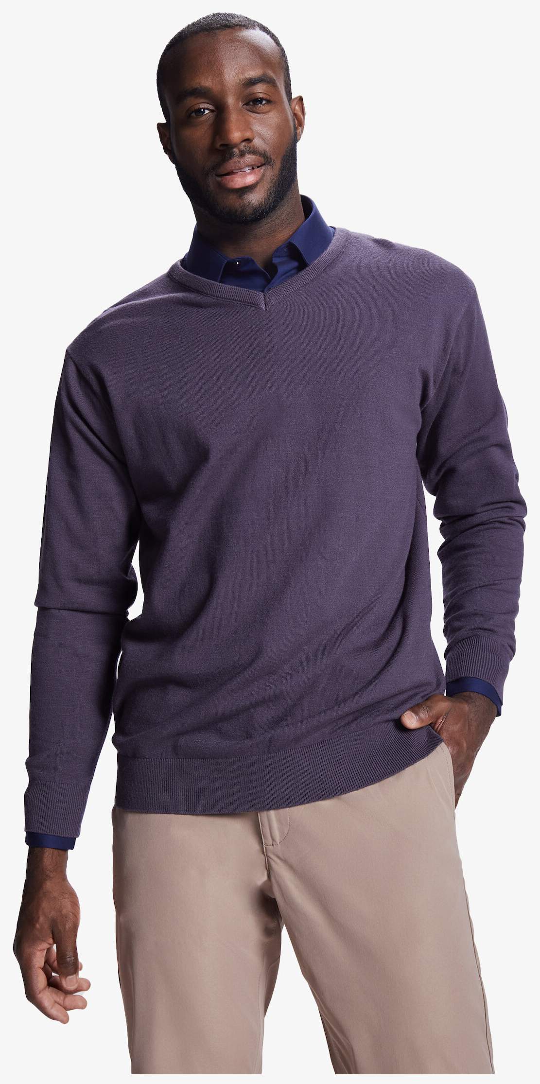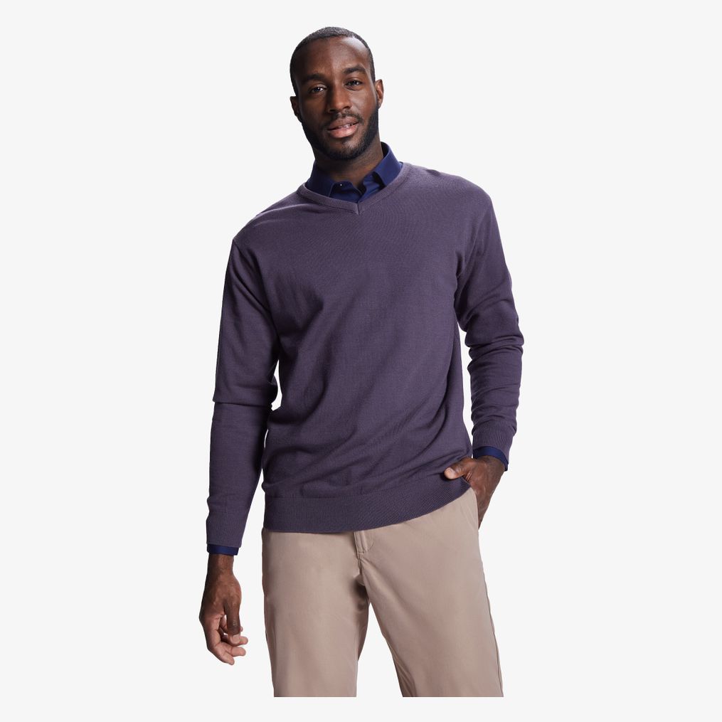 Sweter męski z dekoltem w serek o drobnym splocie z prążkowanym ściągaczem 1x1 na dekolcie, mankietach i obrębie.