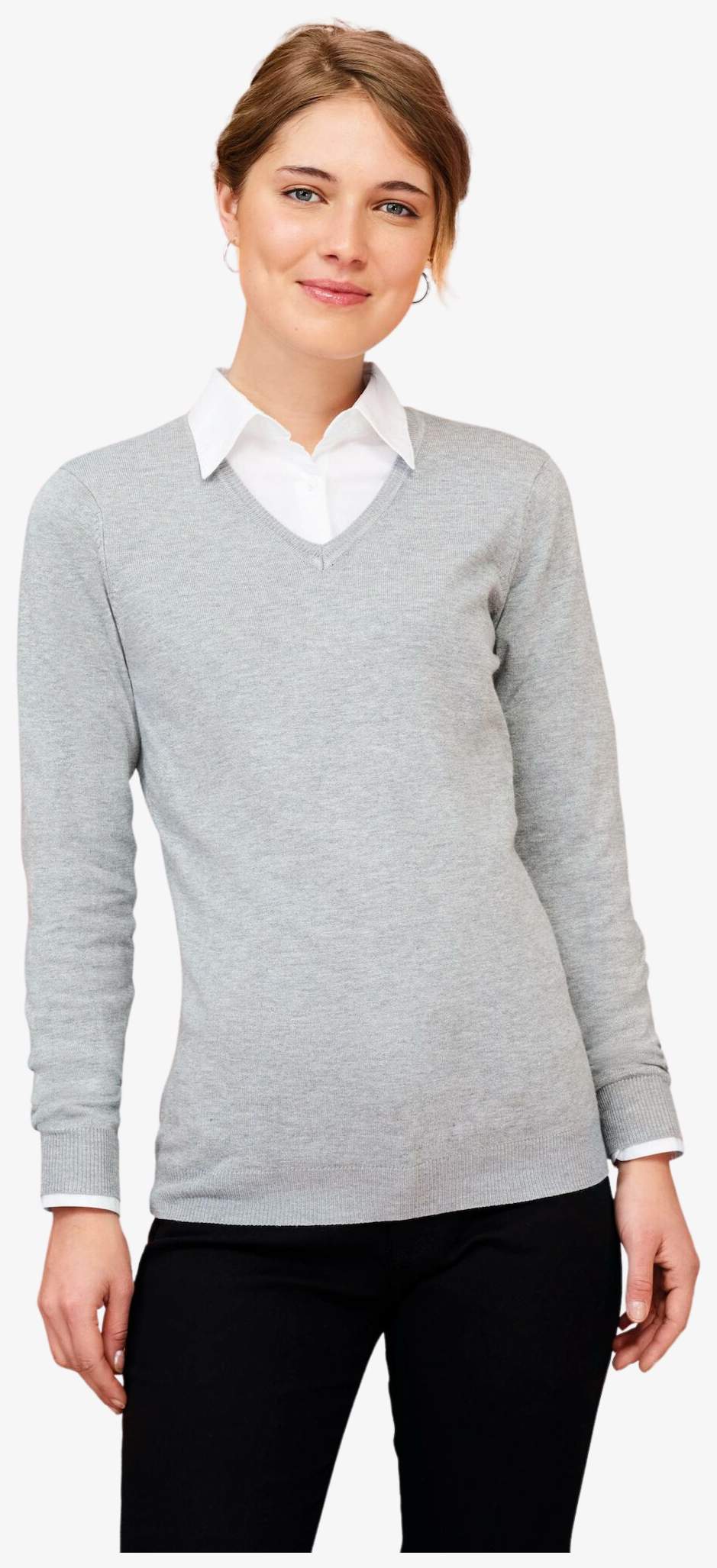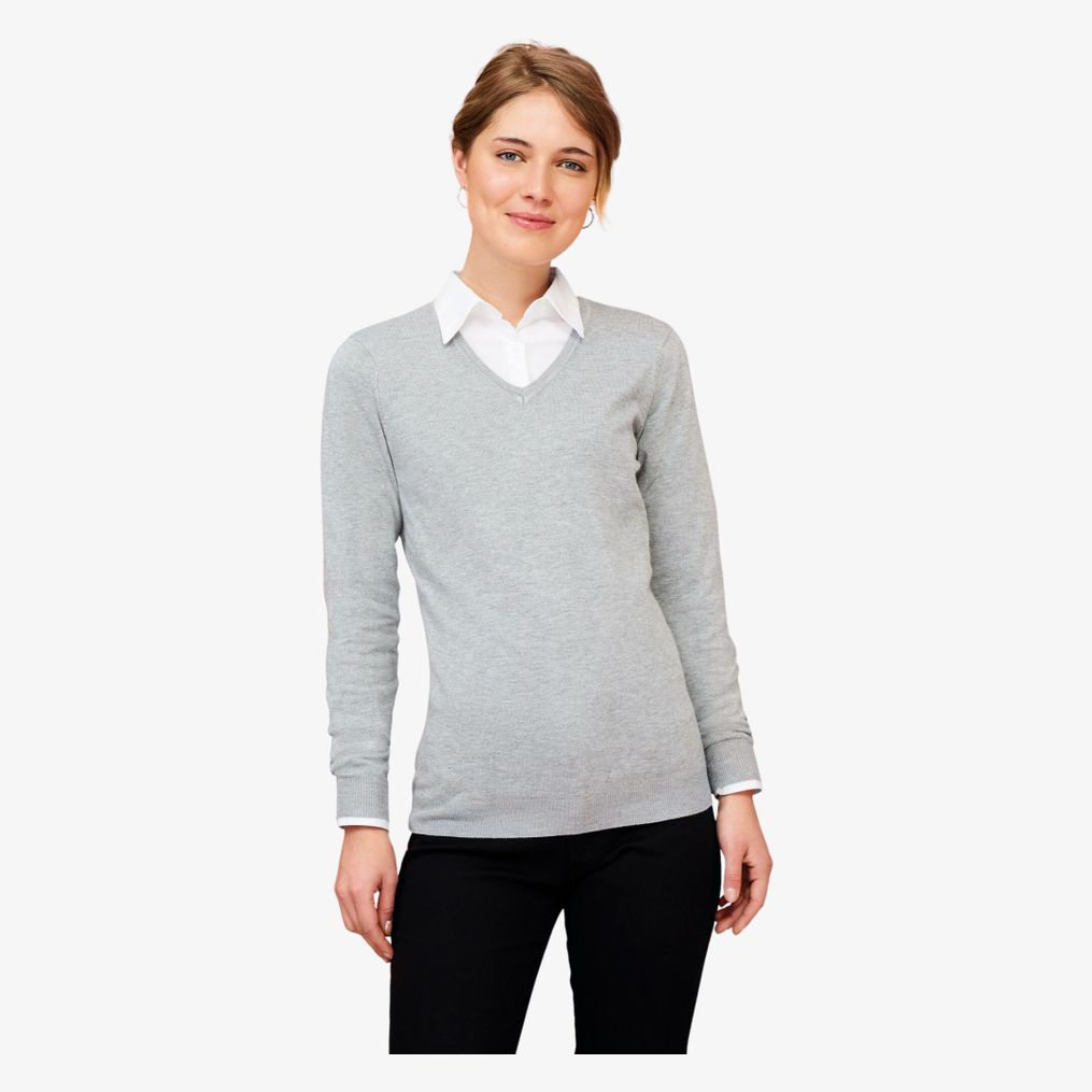 Damski sweter z dekoltem w serek ma dopasowany krój z dolnymi mankietami ściągaczowymi 1x1 zawierającymi włókno elastanowe dla lepszego dopasowania. Raglanowe rękawy wykonane są z ubytkami dla lepszego dopasowania.