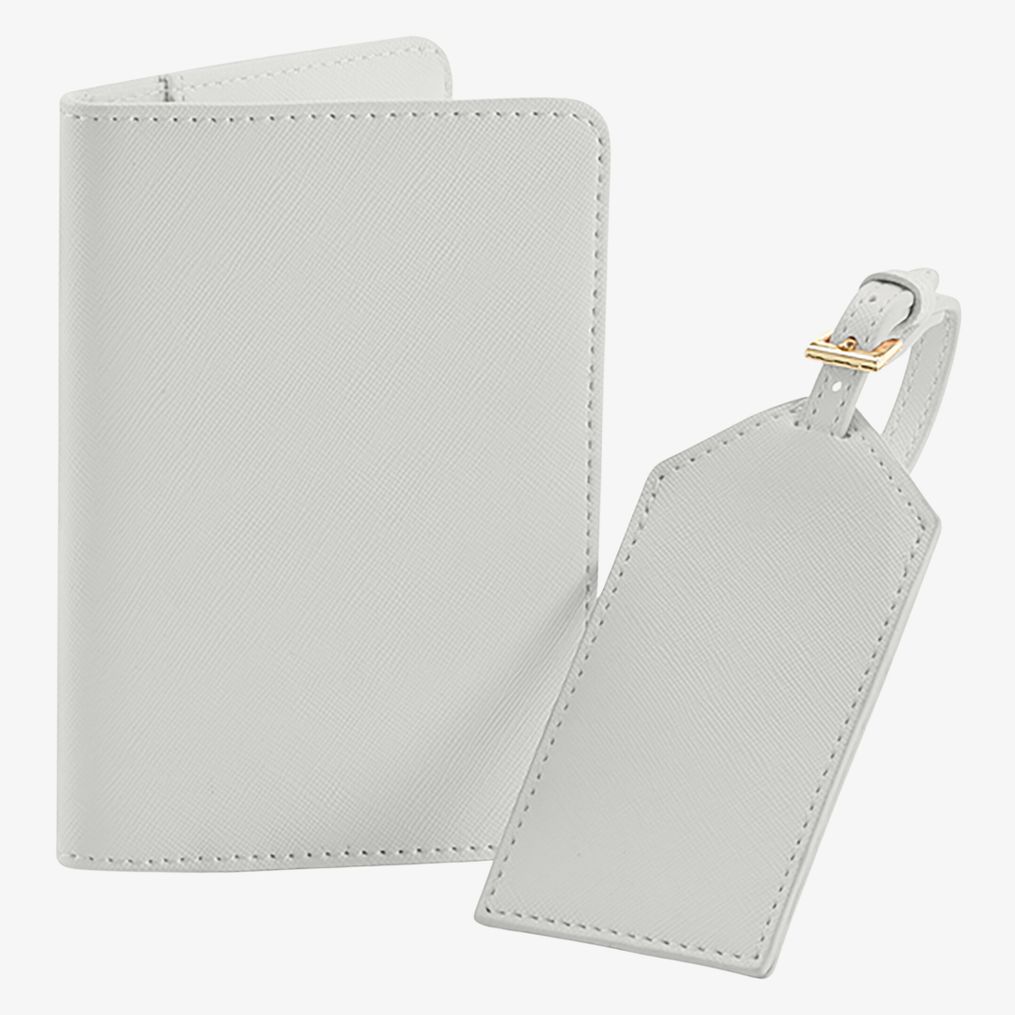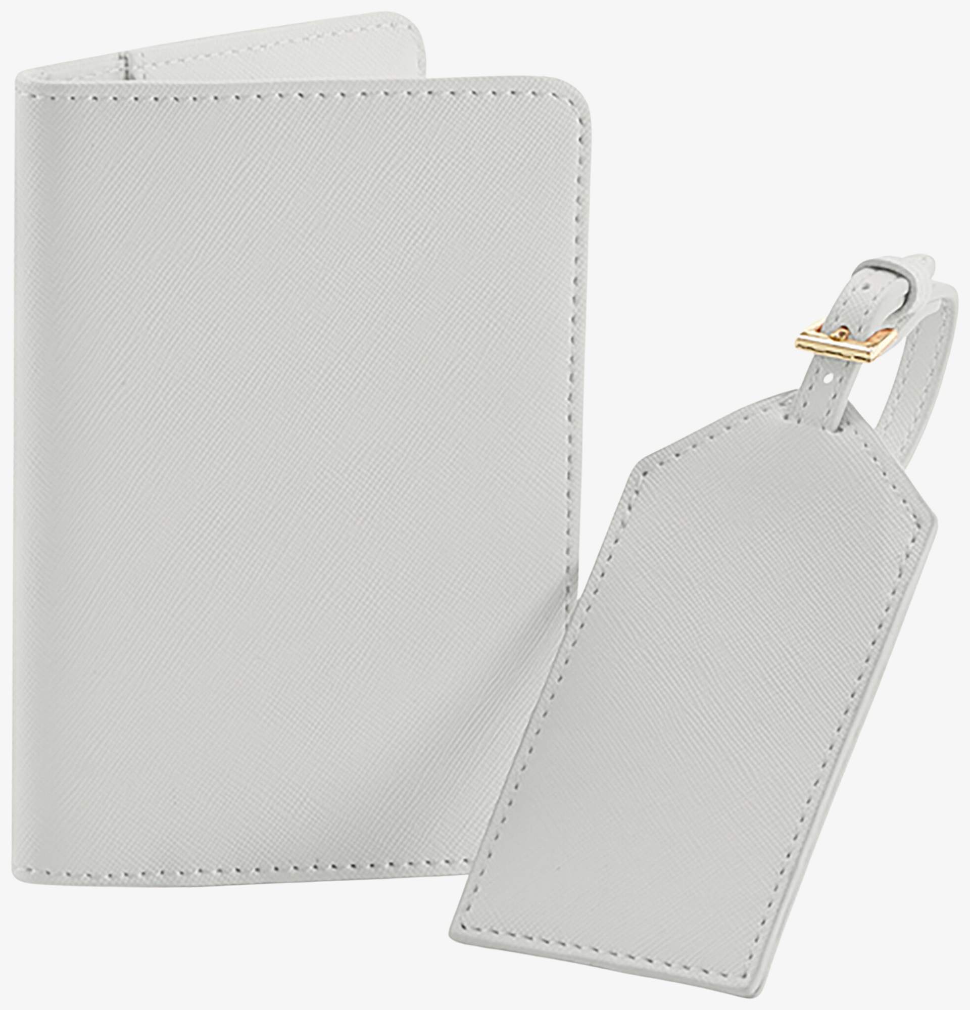 accessoires voyage zawierają etykietę identyfikacyjną i etui na paszport z błyszczącą złotą metalową lamówką. Skład to 100% poliuretan o fakturze drobnoziarnistej skóry Saffiano.