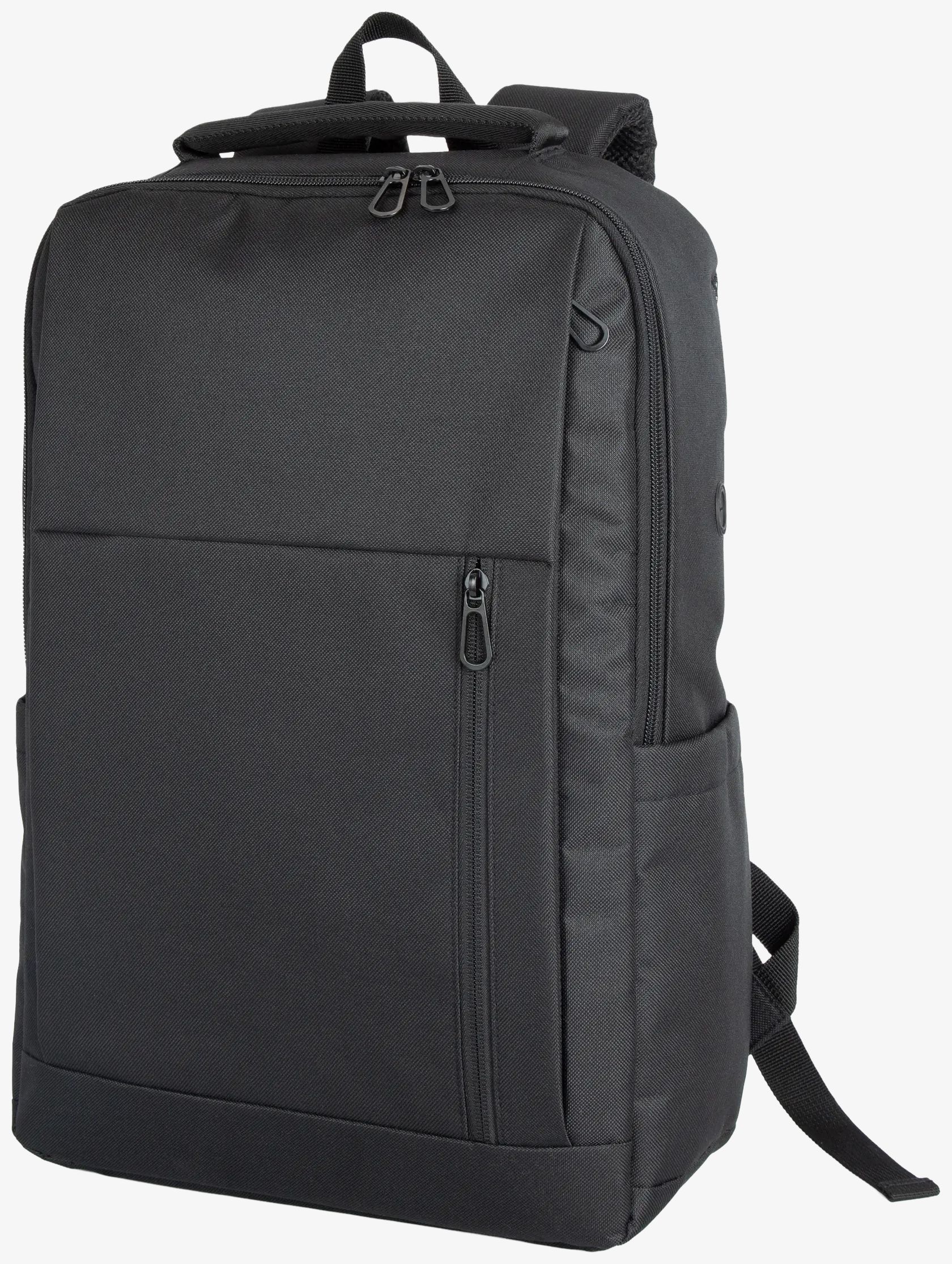 Biznesowy plecak zawiera główną przegródkę odpowiednią na laptop do 15\". Posiada dużą pionową kieszeń frontową zamykaną na zamek oraz niezawierającą podszewki, zamykaną na zamek kieszeń frontową. Dwie boczne kieszenie służą do przechowywania butelek. Tył wykonany z oddychającej siateczki dla większego komfortu.