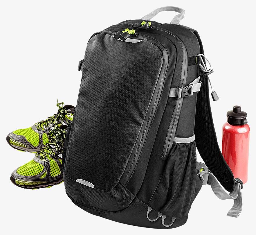 Plecak z poliestru łączy nierozdzieralny materiał typu plaster miodu 600D z odpinaną wodoodporną osłoną. Kompatybilny z laptopami do 15,6 cala, posiada regulowane wyściełane szelki i elementy odblaskowe. Konstrukcja zawiera ergonomiczny wyściełany tył z siatki oraz regulowane paski stabilizujące na klatkę piersiową i brzuch.