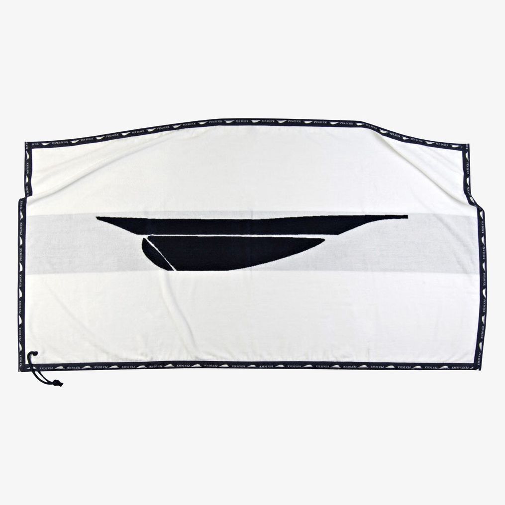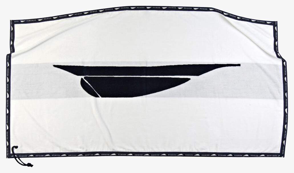 Drap plage velours z bawełny welurowej nadaje się na plażę lub przy basen, z nadrukowaną lamówką i pętlą ze sznura w stylu marynistycznym. Wymiary 100x180 cm.
