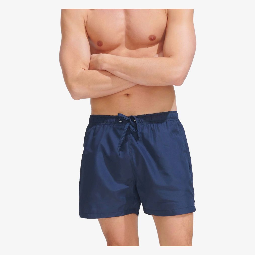 Szorty Sandy z mikrofibry poliestrowej zaprojektowane do kąpieli męskich. Wyposażone w elastyczny pas z tonowanym sznurkiem, dwie kieszenie boczne oraz tylną kieszeń z klapką na rzep. Boczne rozcięcia ułatwiają ruchy.