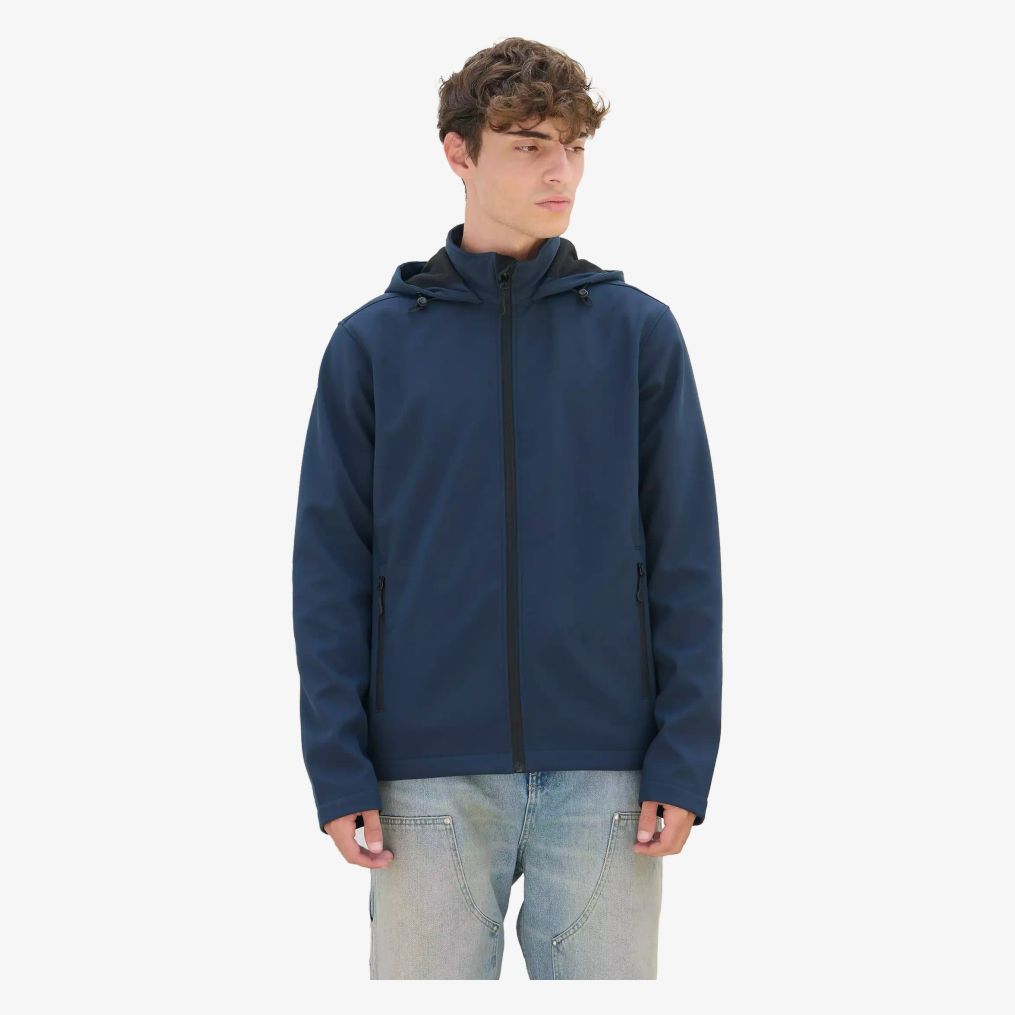 Kurtka softshell z kapturem dla mężczyzn posiada główne zapięcie oraz boczne kieszenie zapinane na czarny nylonowy zamek. Kaptur wyposażony w sznurek do regulacji. Tył lekko wydłużony.