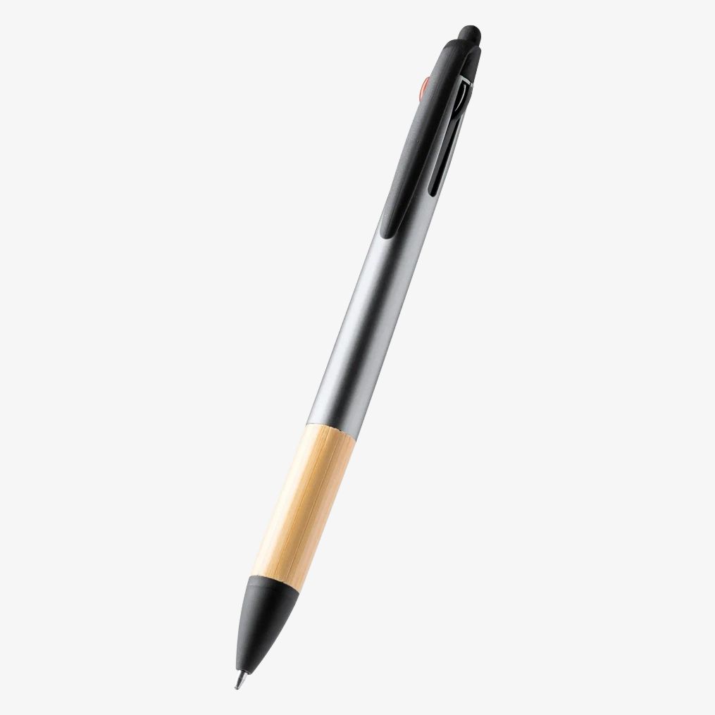 Przyciskowy długopis z trzema wkładami to praktyczne, uniwersalne narzędzie do pisania. Mechanizm umożliwia łatwy wybór między wkładami niebieskim, czarnym i czerwonym. Korpus wykonany z ABS, uchwyt bambusowy, co zapewnia komfort podczas użytkowania. Zintegrowany wskaźnik dotykowy na przeciwległym końcu do precyzyjnej obsługi ekranów dotykowych.