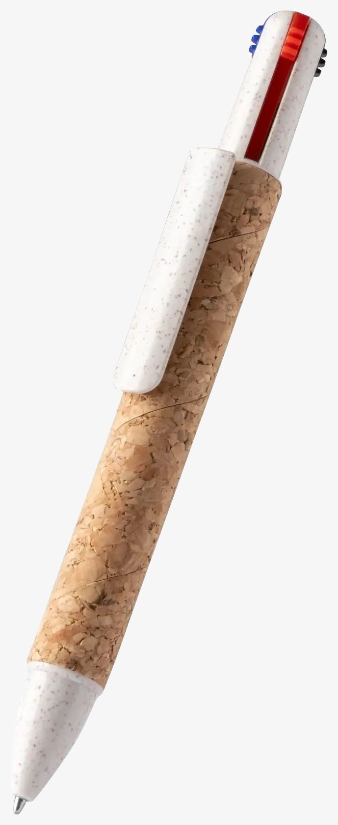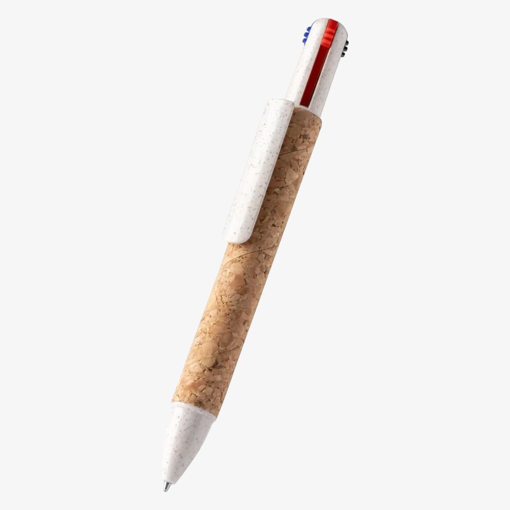 Długopis kulkowy wysuwany CORLES posiada cztery różne atramenty i konstrukcję łączącą korek oraz włókna pszenicy. Umożliwia pisanie niebieskim, czerwonym i czarnym atramentem.