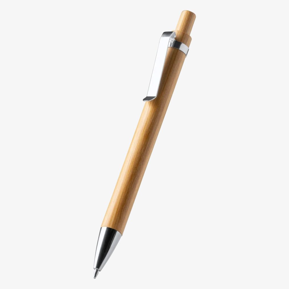 Długopis kulkowy z bambusa zawiera metalowe detale i używa niebieskiego tuszu. Jego główny składnik to bambus.