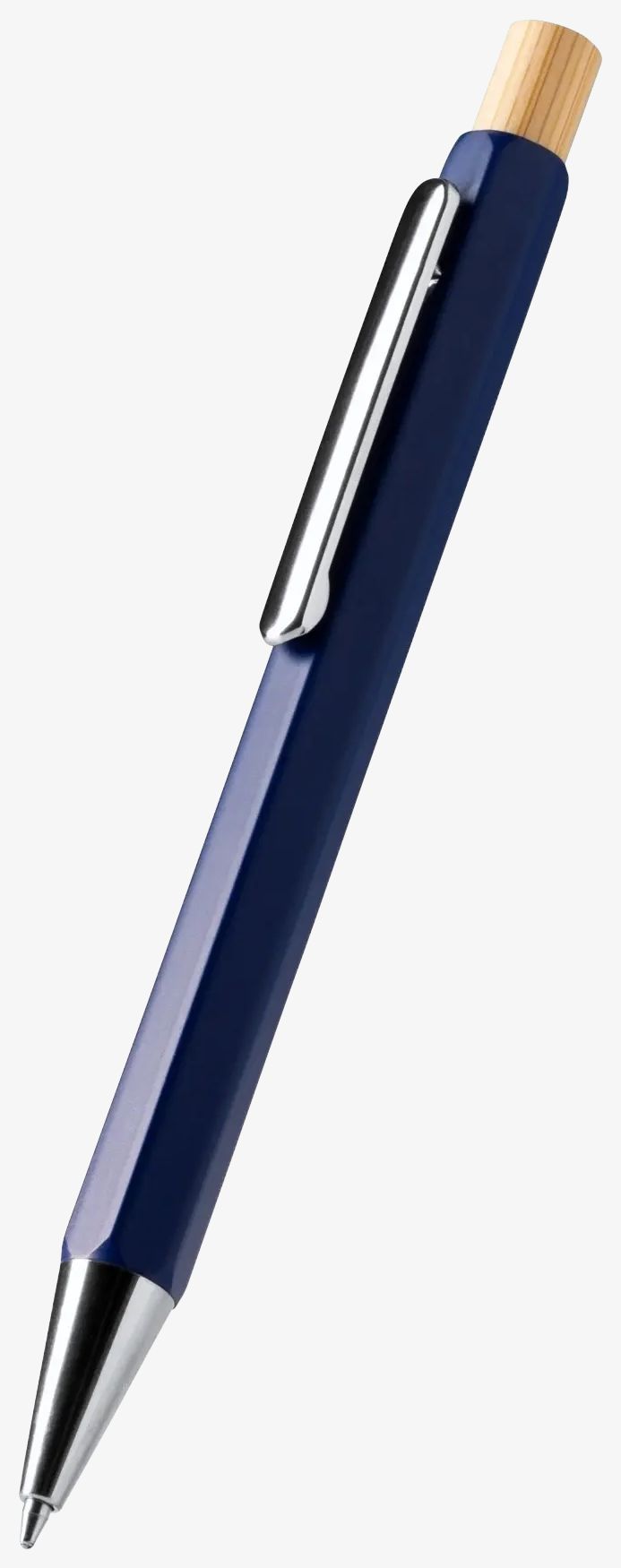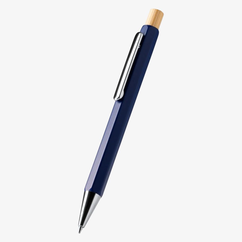 Sześciokreślony długopis ma metalowy korpus i bambusowy przycisk, który dodaje naturalnego akcentu. Metalowy klips łączy elegancję i funkcjonalność. Wkład jumbo z niebieskim atramentem zapewnia płynne i trwałe pisanie.