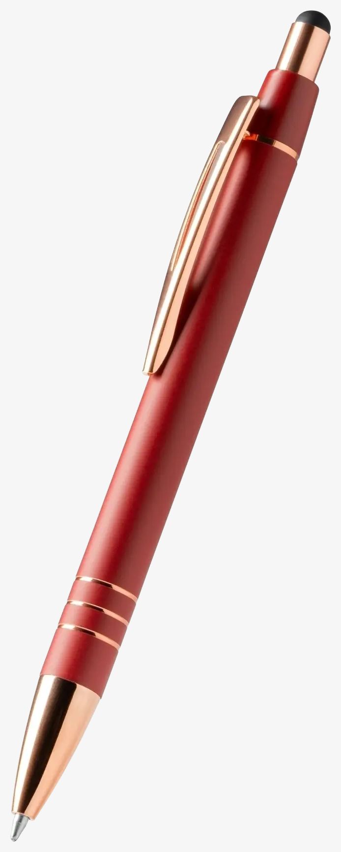 Długopis z przyciskiem posiada matowy metalowy korpus z miedzianymi detalami oraz końcówkę dotykową na przycisku. Używa naboju z niebieskim atramentem jumbo.