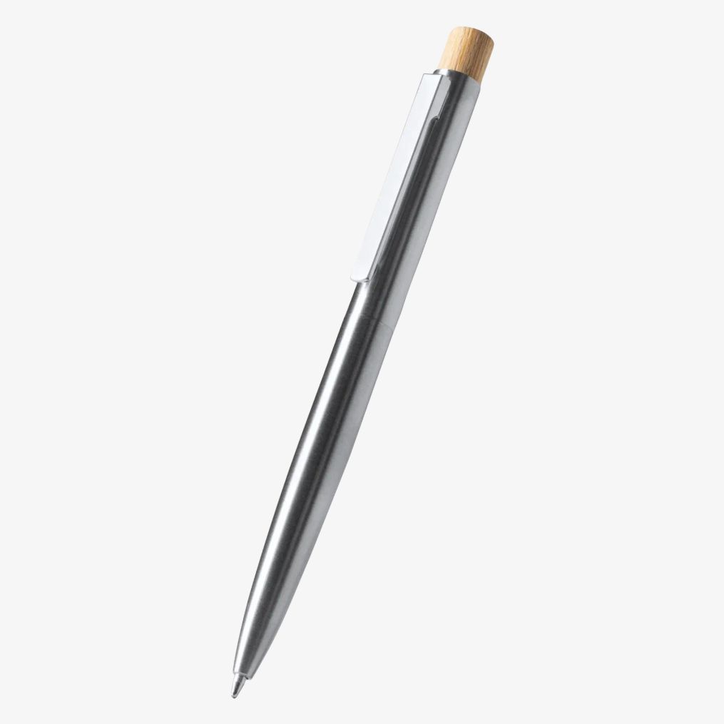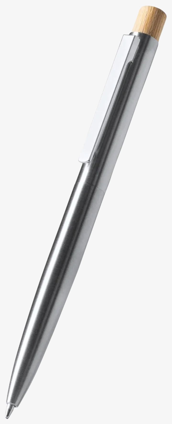 Długopis kulkowy z korpusem ze stali nierdzewnej z recyklingu i przyciskiem z bambusa łączy trwałość i funkcjonalność. Niebieska wkład jumbo zapewnia płynne i długotrwałe pisanie.