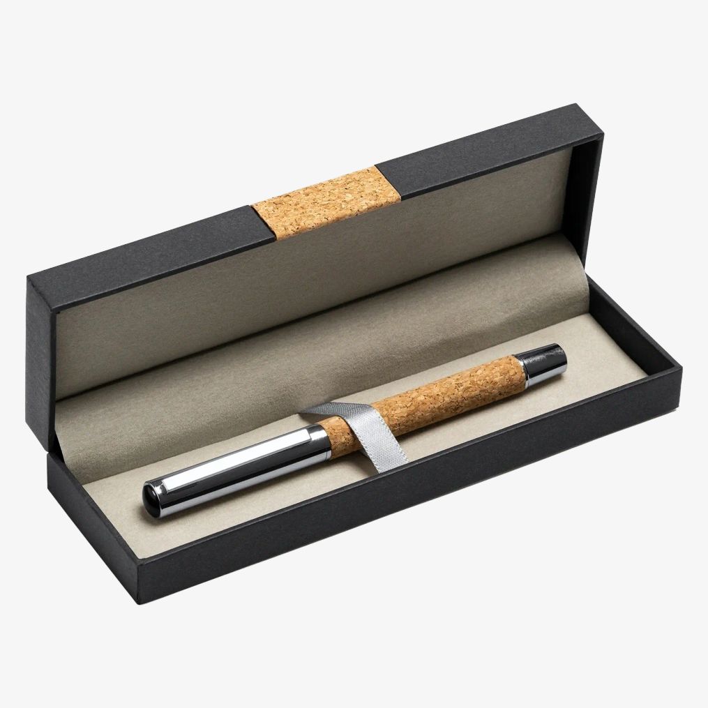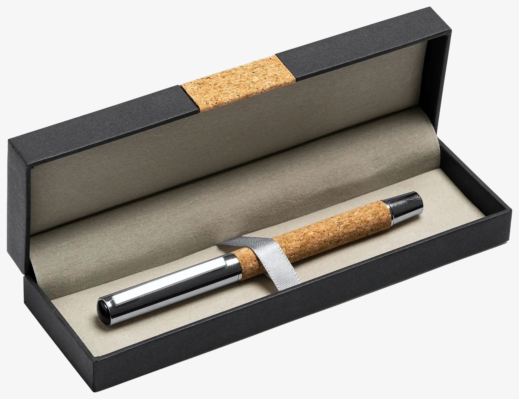 Długopis automatyczny SUVER posiada korpus z naturalnego korka i stali z niebieskim tuszem. Dostarczany w etui korkowym z wyściółką wewnętrzną.