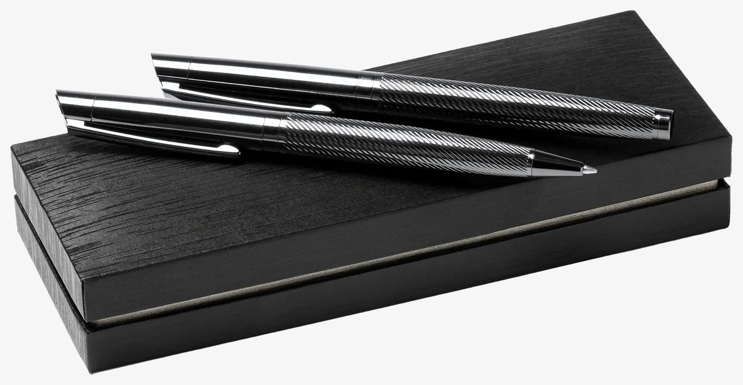 Długopis z obrotowym wałkiem REYDON wykonany z metalu z niebieskim atramentem. Zapakowany w wyściełane skórzane etui z wewnętrzną podszewką.