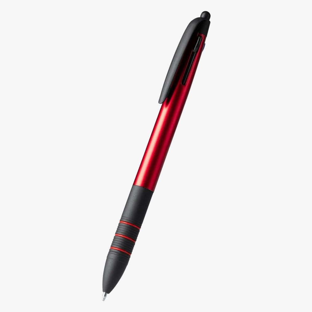 Długopis kulkowy z mechanizmem wysuwania i 3 kolorami atramentu posiada korpus z ABS z czarnymi detalami oraz miękki uchwyt. Wyposażony jest we wskaźnik dotykowy i używa atramentów niebieskiego, czarnego i czerwonego.