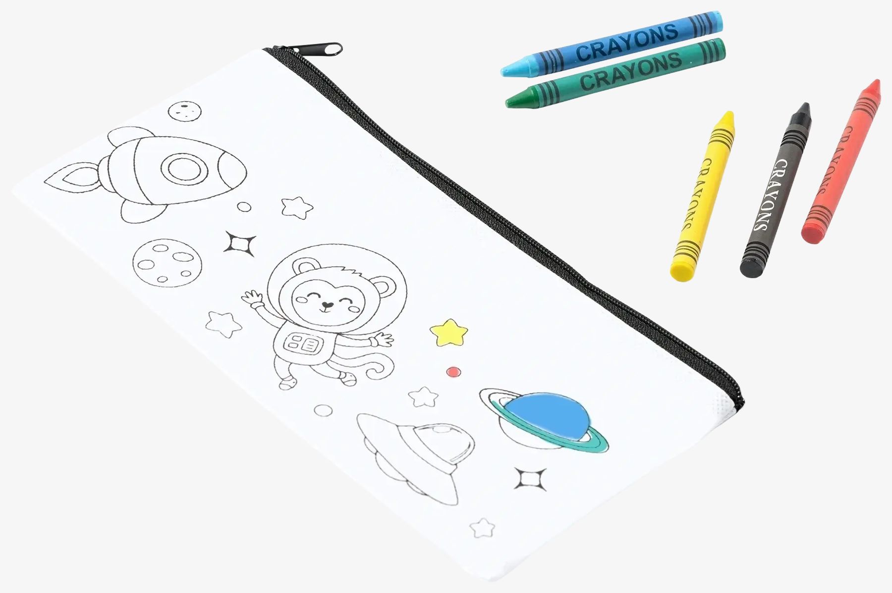 Torebka z włókniny SOLAZ przeznaczona do przechowywania kredek i małych akcesoriów dla dzieci. Zawiera 5 różnokolorowych kredek do kolorowania, wymiary 22 x 11 cm.