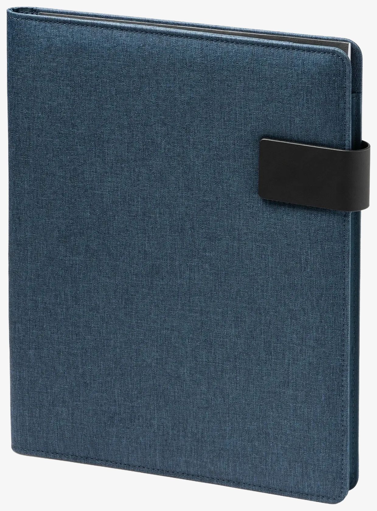 Uniwersalne etui na dokumenty A4 wykonane z tkaniny melanż RPET 600 D z magnetycznym zatrzaskiem. Zawiera odpinany notatnik z 30 liniowanymi kartkami oraz cztery wewnętrzne kieszenie na długopisy.
