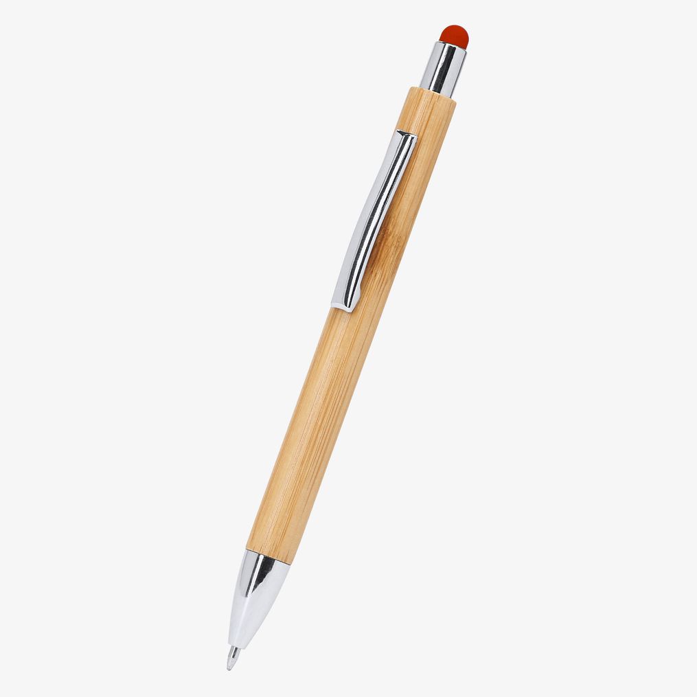 Długopis kulkowy Pampa ma korpus z bambusa z klipsem i przyciskiem z metalu w kolorze srebrnym. Wyposażony w dużą końcówkę 1,0 mm z niebieskim atramentem. Wskaźnik dotykowy jest zintegrowany z klipsem dla dodatkowego użycia.