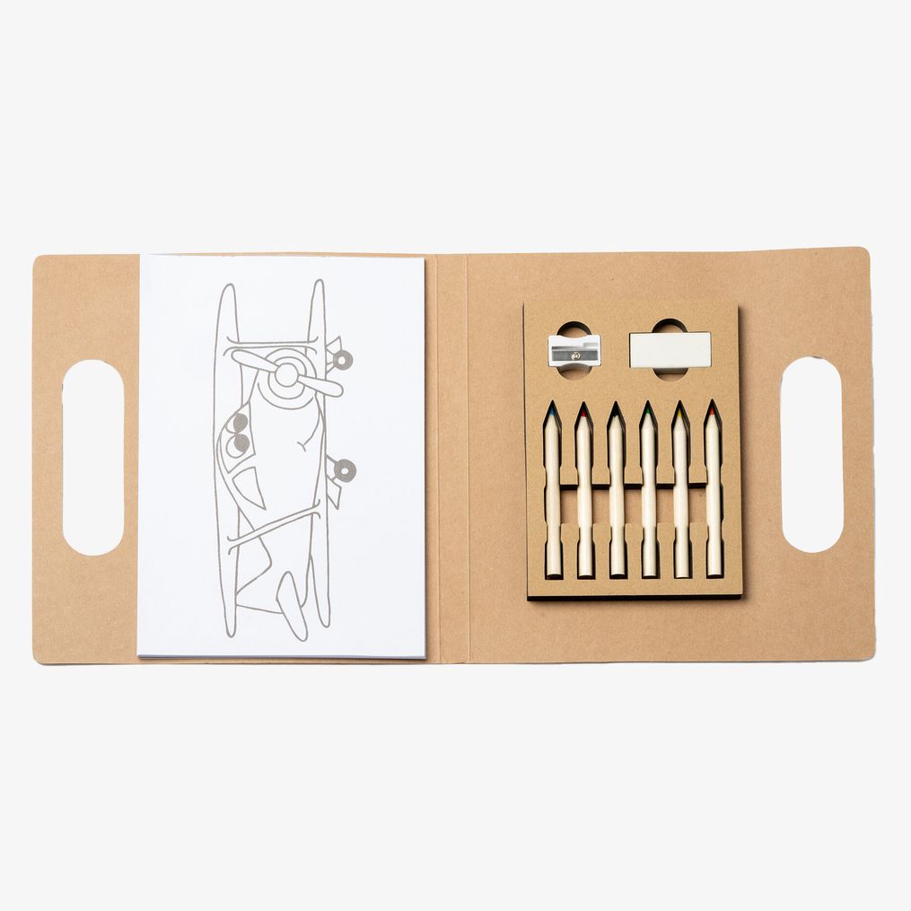 Zestaw zabaw dla dzieci z blokiem zawierającym różne rysunki do kolorowania, 6 kredkami, temperówką i gumką. Umożliwia kreatywną aktywność w podróży.