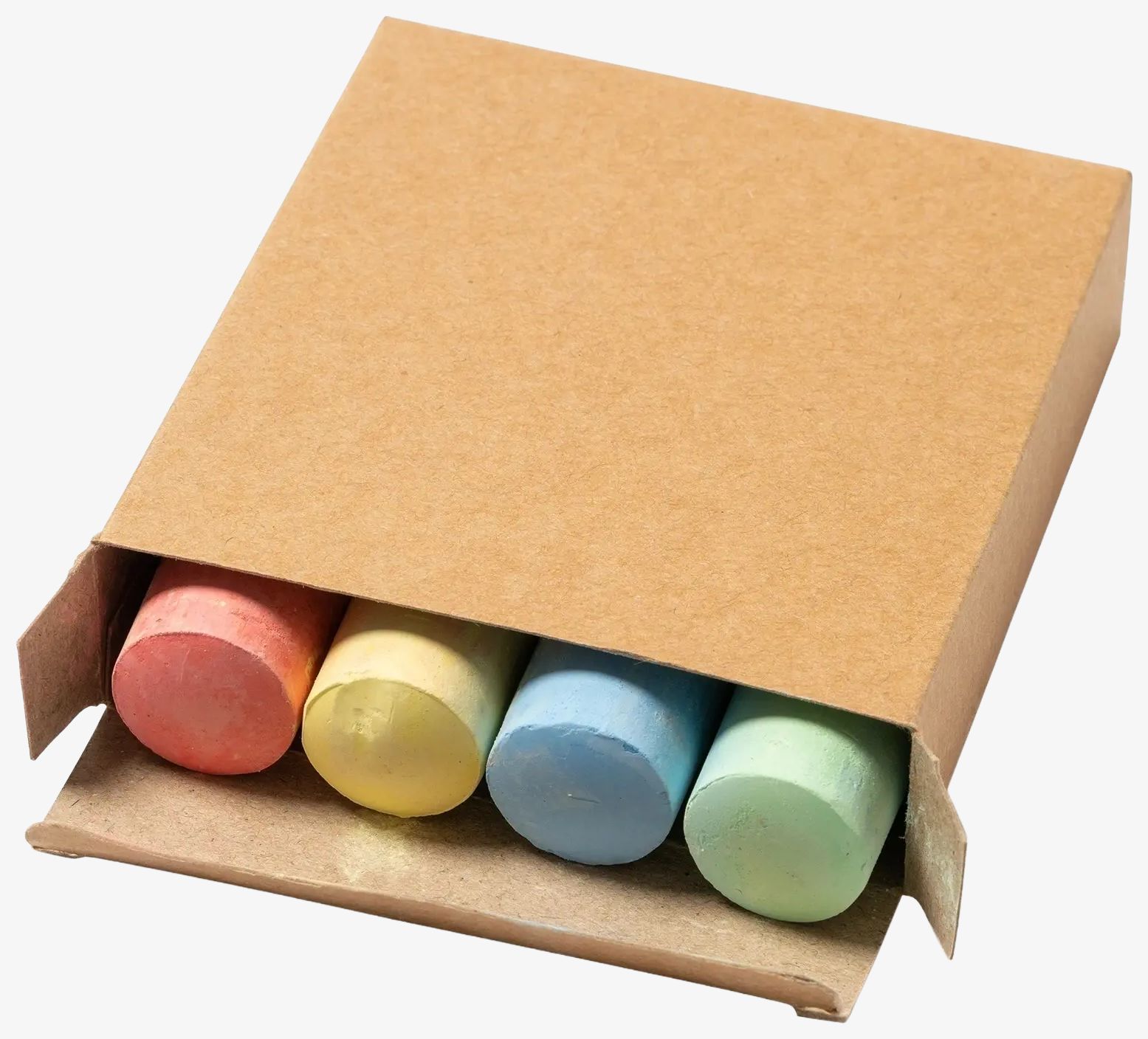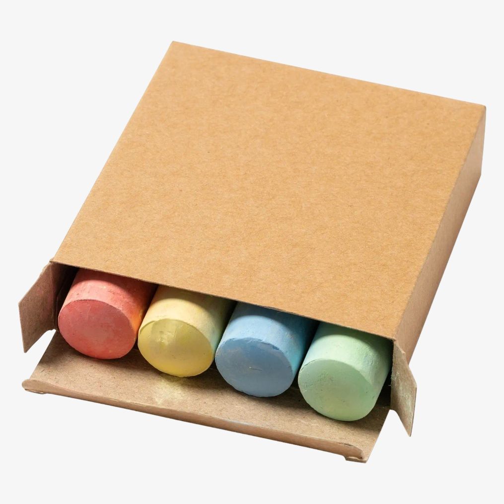 Zestaw zawiera 4 grube kredy w kolorze niebieskim, czerwonym, zielonym i żółtym w pudełku ekologicznym. Wymiary to 10,5 x 9,5 x 2,5 cm.