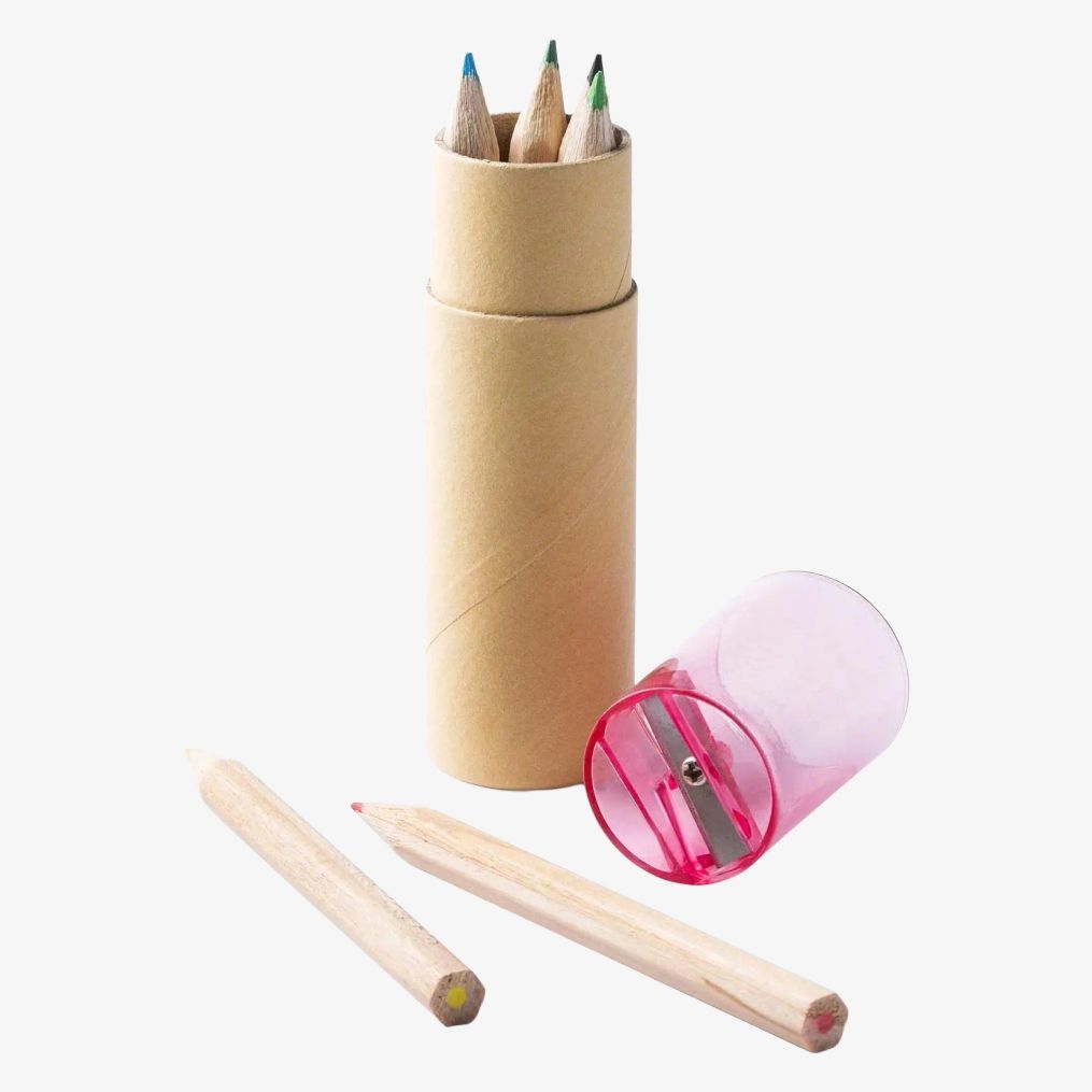 Zestaw zawiera 6 drewnianych ołówków w etui z recyklingowanego kartonu z kolorową przezroczystą nasadką. Każda nasadka zawiera temperówkę. Dostępne kilka kolorów.