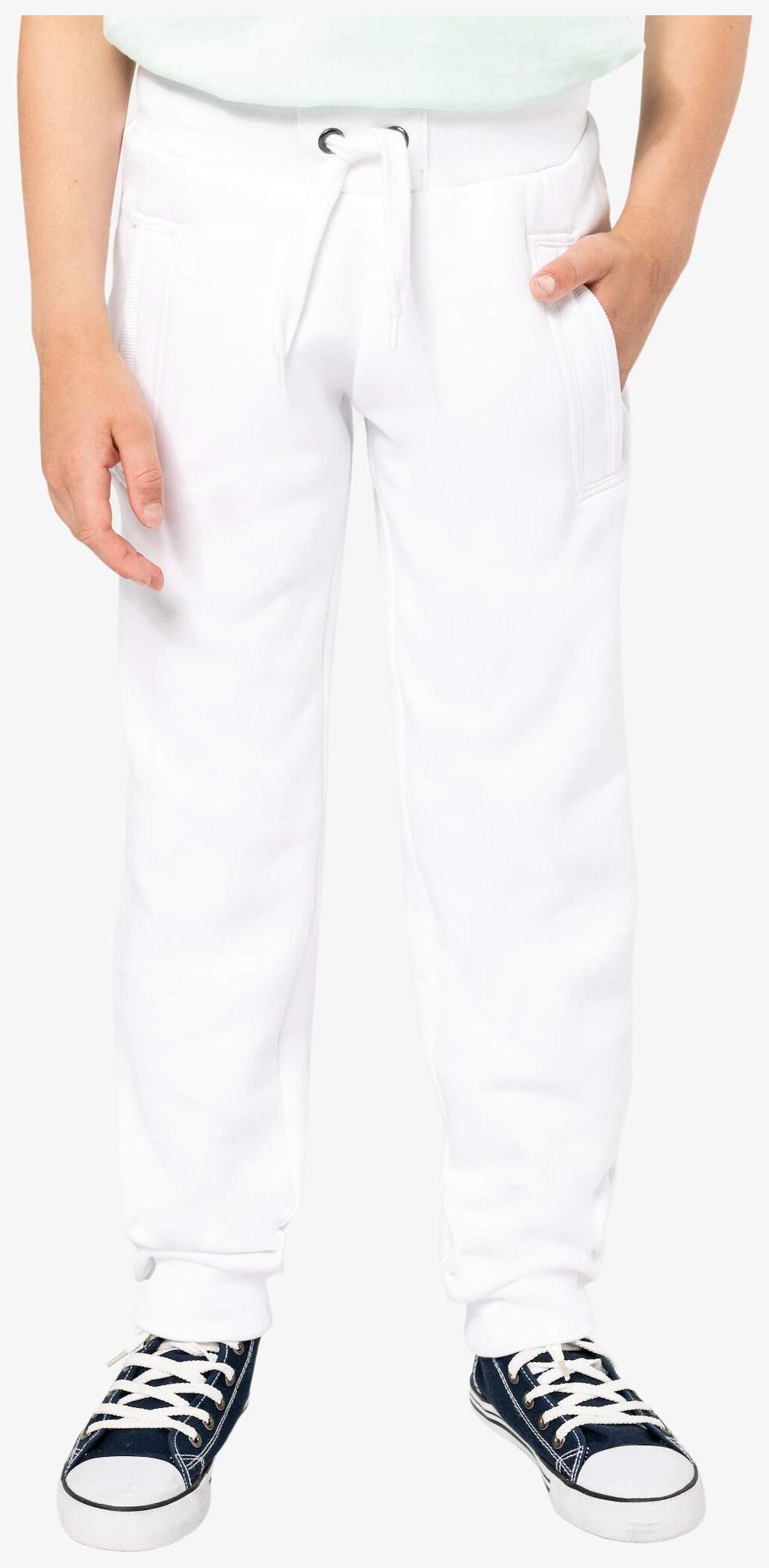 pantalon jogging enfant wykonany z dzianiny drapanej, składającej się w 80% z bawełny i 20% poliestru. Zawiera dwie kieszenie boczne i kieszeń z tyłu naszywaną. W pasie szeroki ściągacz z sznurkiem. Nogawki wykończone ściągaczem 1x1.