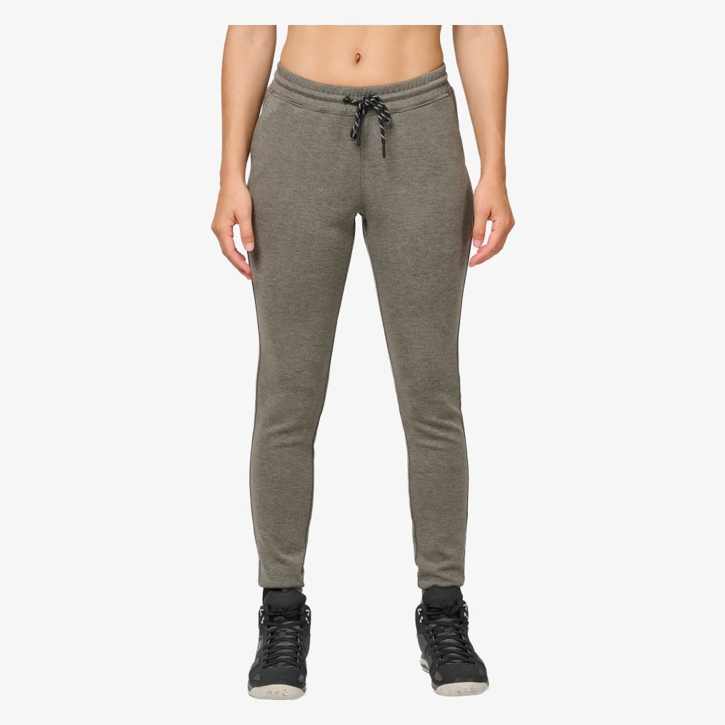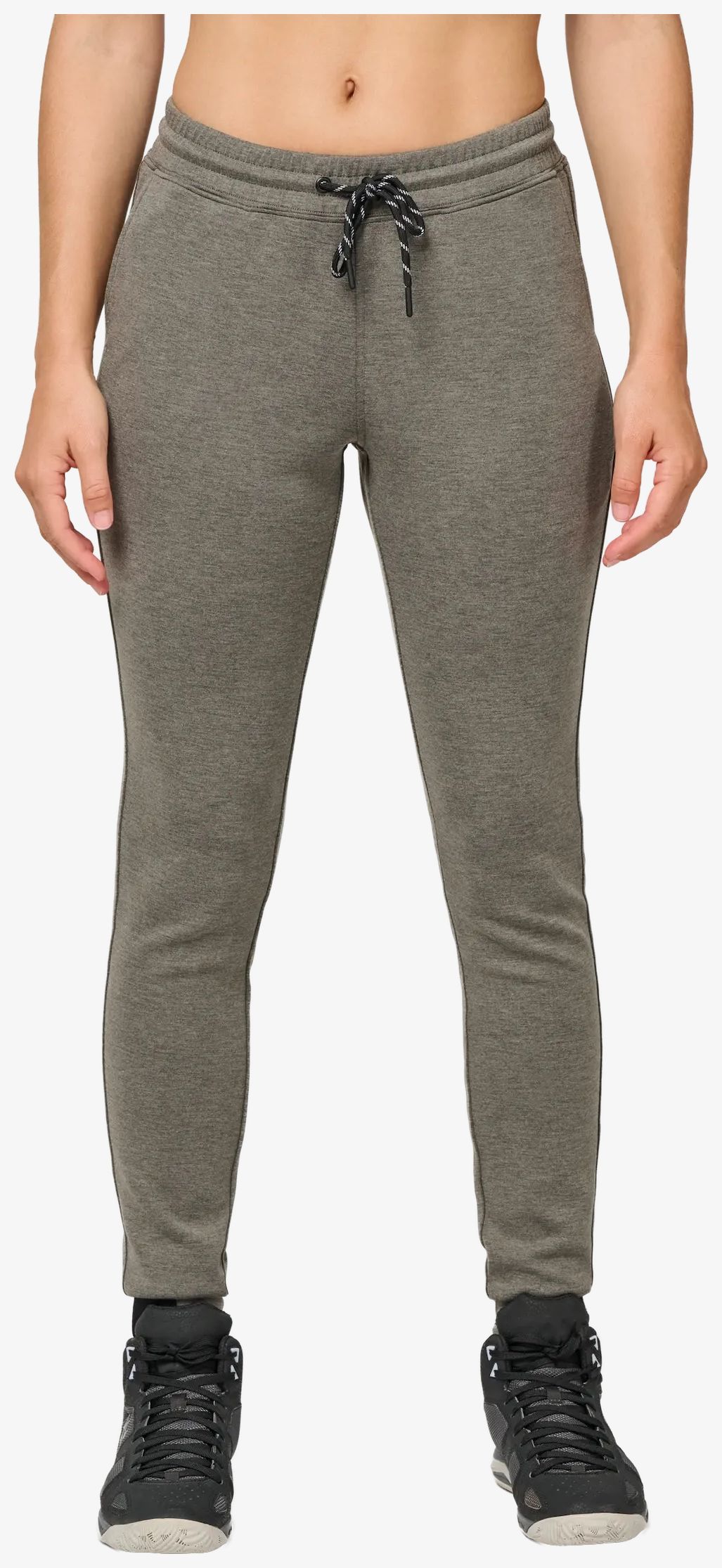 pantalon performance femme łączy poliester i elastan z dopasowanym krojem oraz elastycznym paskiem z regulowanym sznurkiem. Zawiera dwie przednie kieszenie wyłożone dzianiną dżersej oraz tylną kieszeń na zamek z wykończeniem termozgrzewanym. Nogawki zwężone z kontrastowym elastycznym elementem.