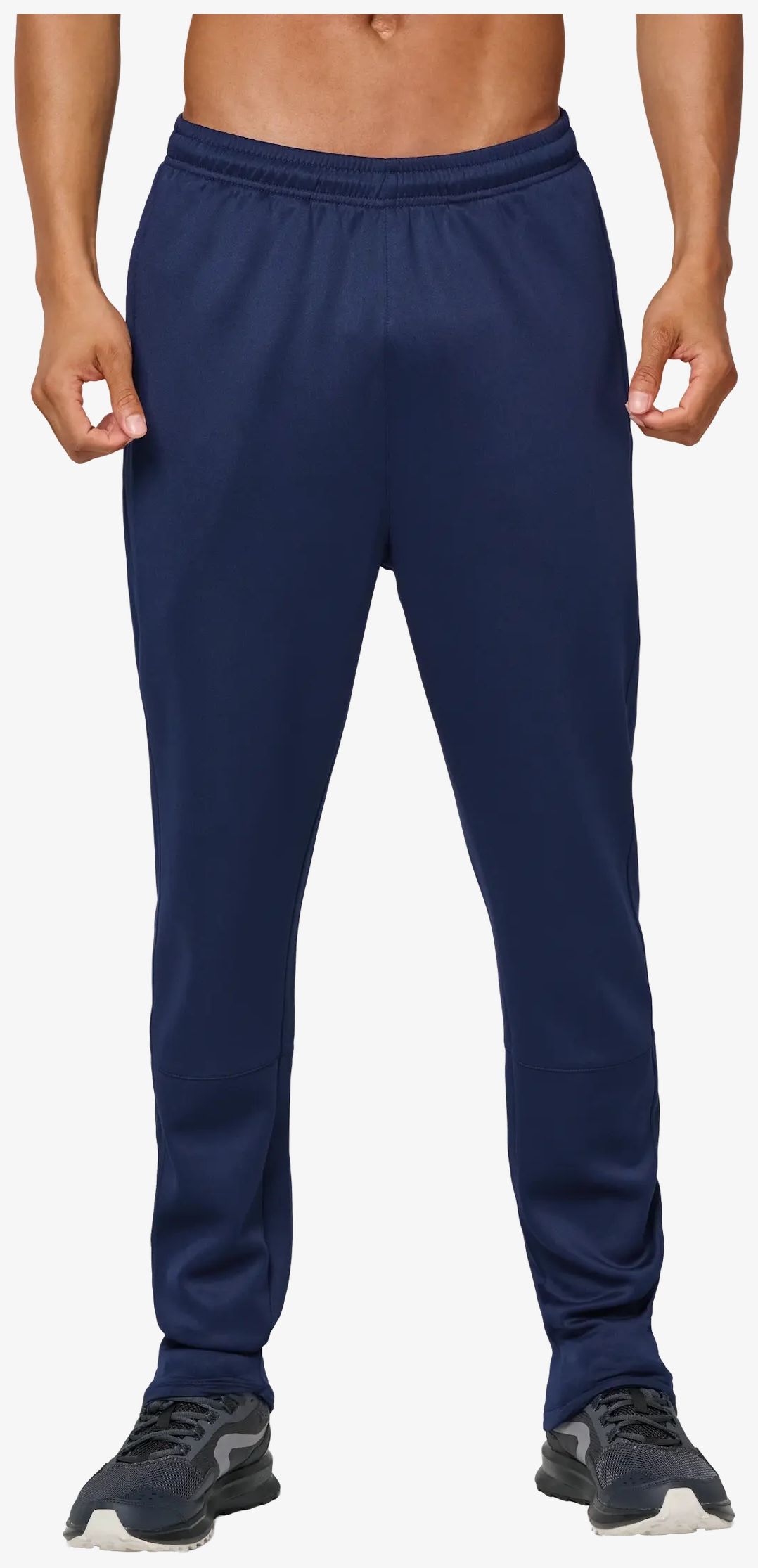 Uniseksowe spodnie treningowe mają prosty krój z dwoma bocznymi kieszeniami na zamek. Elastyczna talia zawiera okrągły sznurek do regulacji z gumową końcówką umieszczoną od wewnątrz. Nogawki zapinane na zamek mają boczne wstawki z fakturowanego materiału.