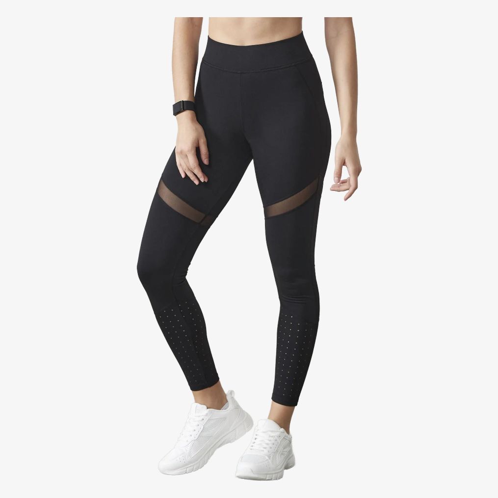 Legginsy damskie stretchowe kryjące łączą rozciągliwą tkaninę i szeroki pas z małą kieszenią wewnętrzną na klucz. Zawierają wstawki z siatki z wycinaniem laserowym oraz odpinaną metkę.