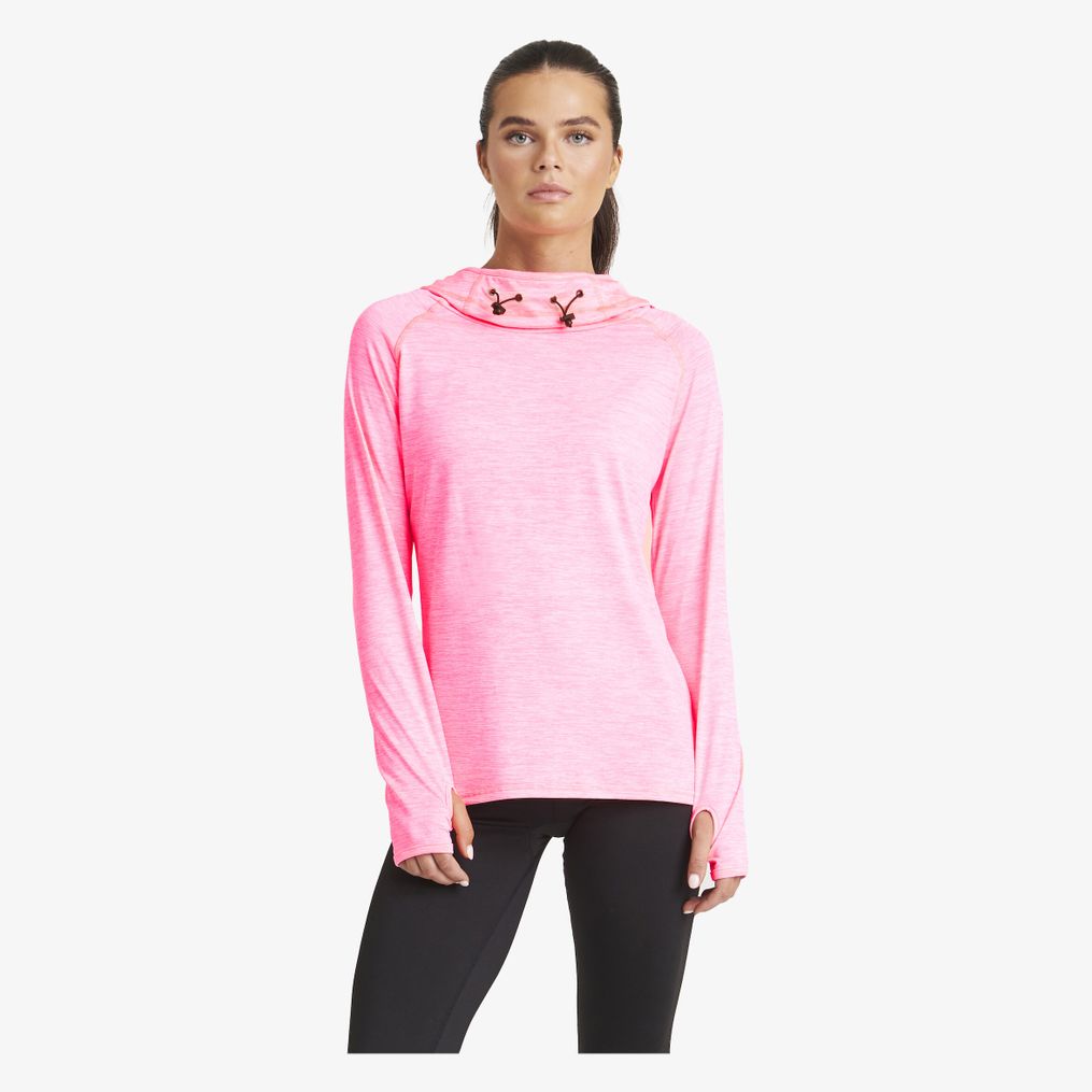 Bluza z kapturem i dekoltem typu wodospad wykonana z tkaniny mieszanej zawierającej 92% poliester i 8% elastan, oferująca elastyczność i wsparcie. Sportowy krój obejmuje rękawy raglan ułatwiające ruchy. Kaptur regulowany z elementami odblaskowymi dla lepszej widoczności przy słabym świetle.