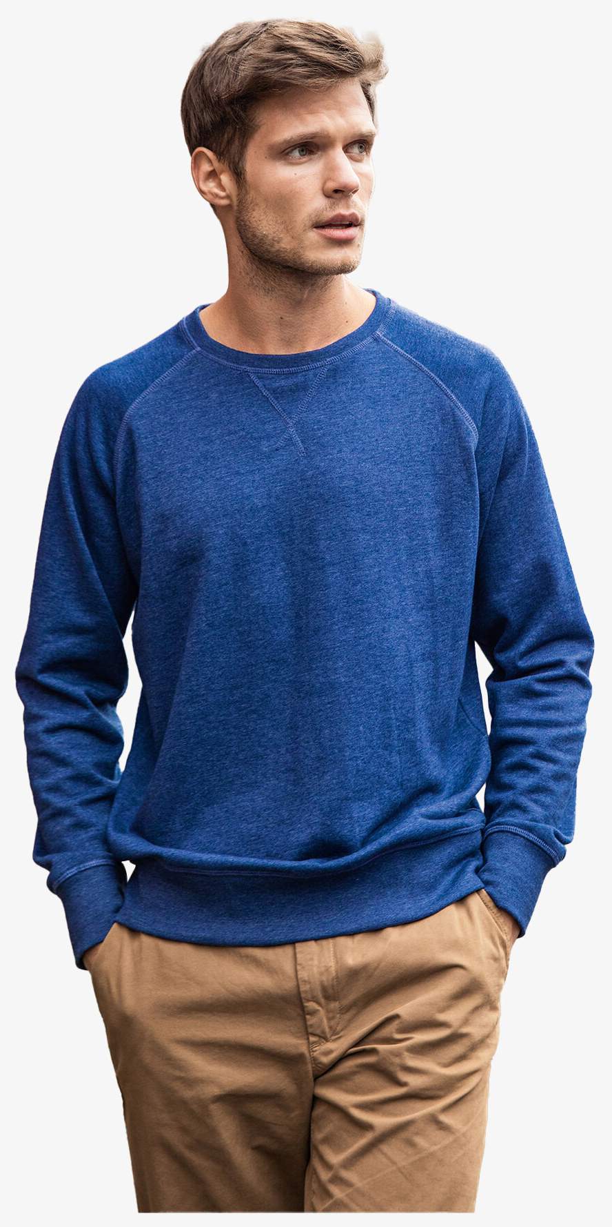 Bluza z bawełny organicznej dla mężczyzn wykonana z francuskiego materiału frotte z 85% czesanej bawełny organicznej i 15% poliestru. Posiada klasyczny okrągły dekolt, raglanowe rękawy, taśmę wzmacniającą, kołnierzyk i mankiety z spandeksu oraz odpinaną metkę na kołnierzu.