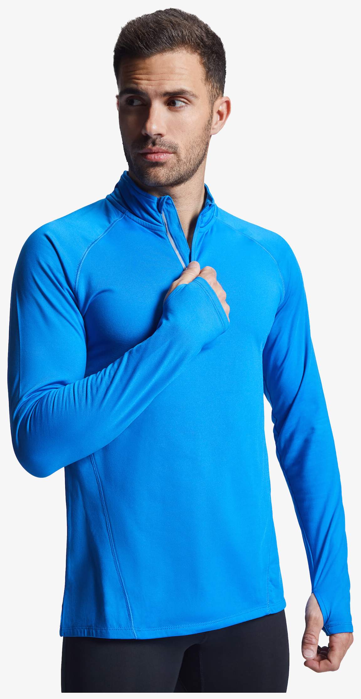 Bluza techniczna z raglanowymi długimi rękawami dla mężczyzn posiada szczotkowaną warstwę wewnętrzną oraz wzmocnioną kontrastową taśmę oczyszczającą wewnątrz kołnierza. Zawiera półodwrócony zamek w tonacji z odblaskowym detalem, mankiet z otworem na kciuk oraz tył nieco dłuższy niż przód.
