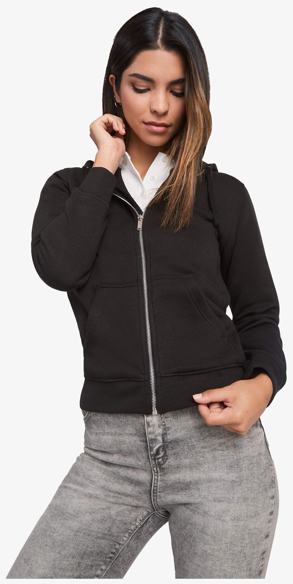 Damska bluza rozpinana Veleta zawiera dopasowany kaptur podszyty tkaniną w tym samym odcieniu z metalowym srebrnym zamkiem z przodu oraz kieszeń kangurka. Taśma wzmacniająca jest umieszczona wewnątrz kołnierza. Mankiety i pas wykonane są z ściągacza 2x2. Krój dopasowany do ciała, odpowiedni do codziennego noszenia.