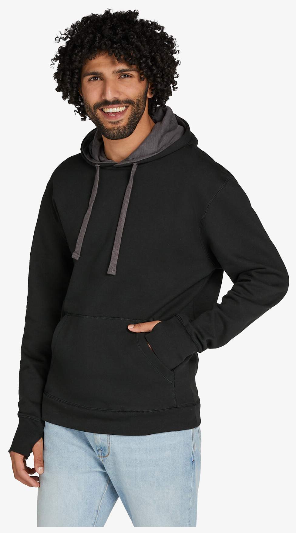 Bluza z kapturem Contrast Hooded Sweatshirt Men składa się z 80% bawełny czesanej ringspun i 20% poliestru, z wyjątkiem koloru Light Oxford, który zawiera 70% bawełny i 30% poliestru. Zawiera podszyty kaptur kontrastowy, wewnętrzną kieszeń kangur z otworem na kciuk oraz płaski sznurek dopasowany do wnętrza kaptura. Szlufki na słuchawki są kontrastowe, a przeszycia wykonane są na 5 punktów.