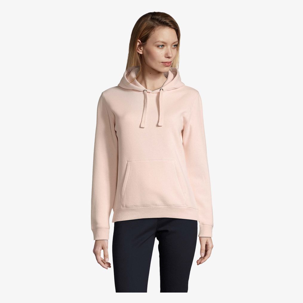 Bluza z kapturem Spencer Women zawiera kieszeń kangurkę oraz podszyty kaptur z troczkiem do regulacji. Bluza jest szyta na miarę z mankietami 2x2 z prążkowanej dzianiny na dole. Posiada półksiężyc wewnątrz kołnierza oraz wewnętrzną taśmę wzmacniającą.