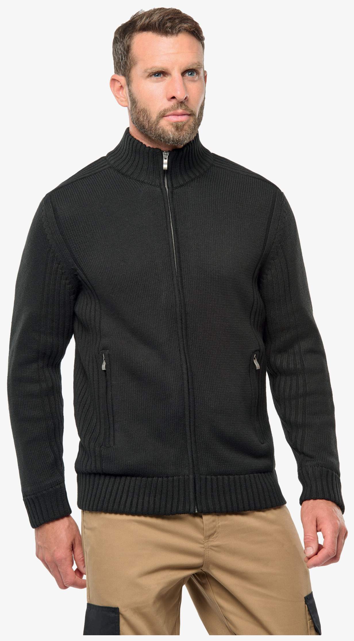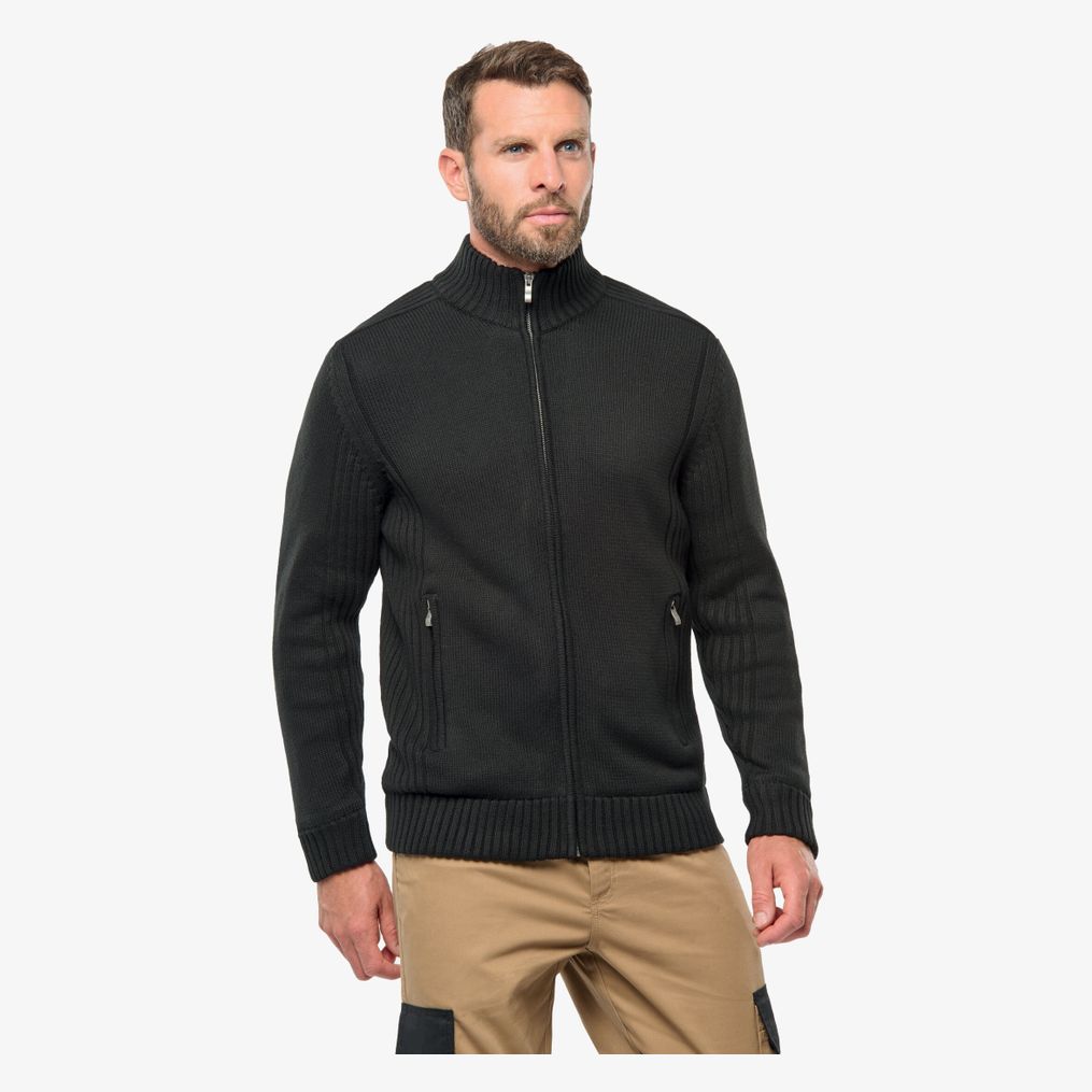 cardigan doublé polaire homme łączy wewnętrzną podszewkę poliestrową na rękawach z zewnętrzną dzianiną bawełnianą i akrylową, zapewniając ciepło i komfort. Wyposażony w dwie przednie kieszenie na zamki oraz podwójną dzianinę ściągaczową przy kołnierzu i rękawach.