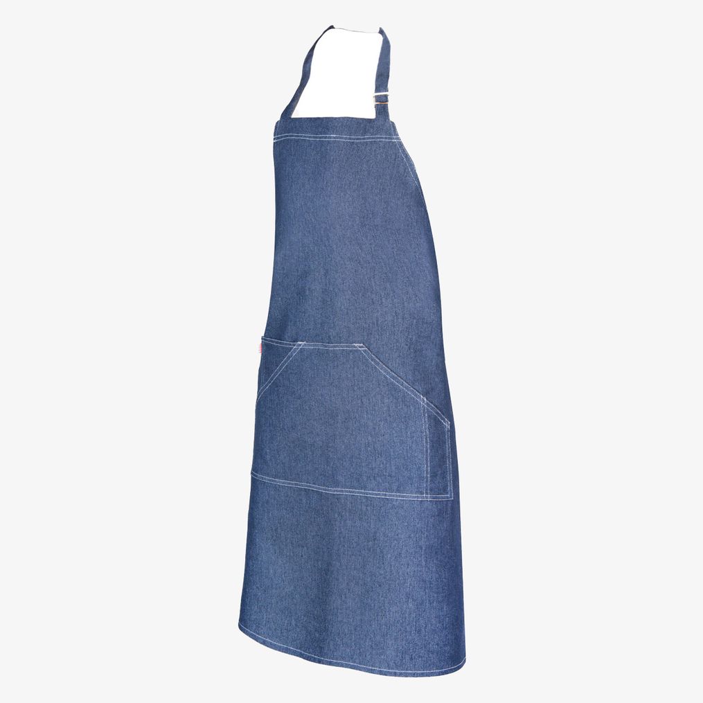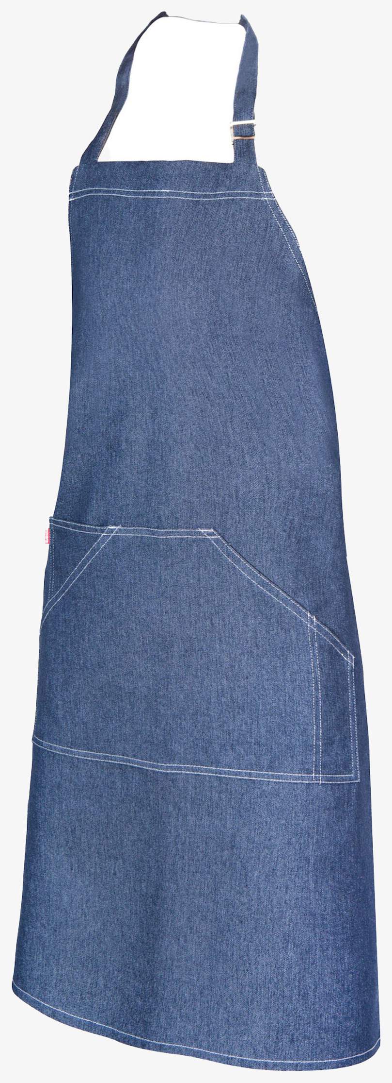 Fartuch z poliestru i bawełny zawiera dwie przednie kieszenie, jedną centralną i jedną skośną. Wyposażony jest w dwie taśmy na końcach do zaciskania oraz regulowany pasek na szyję z klamrą.