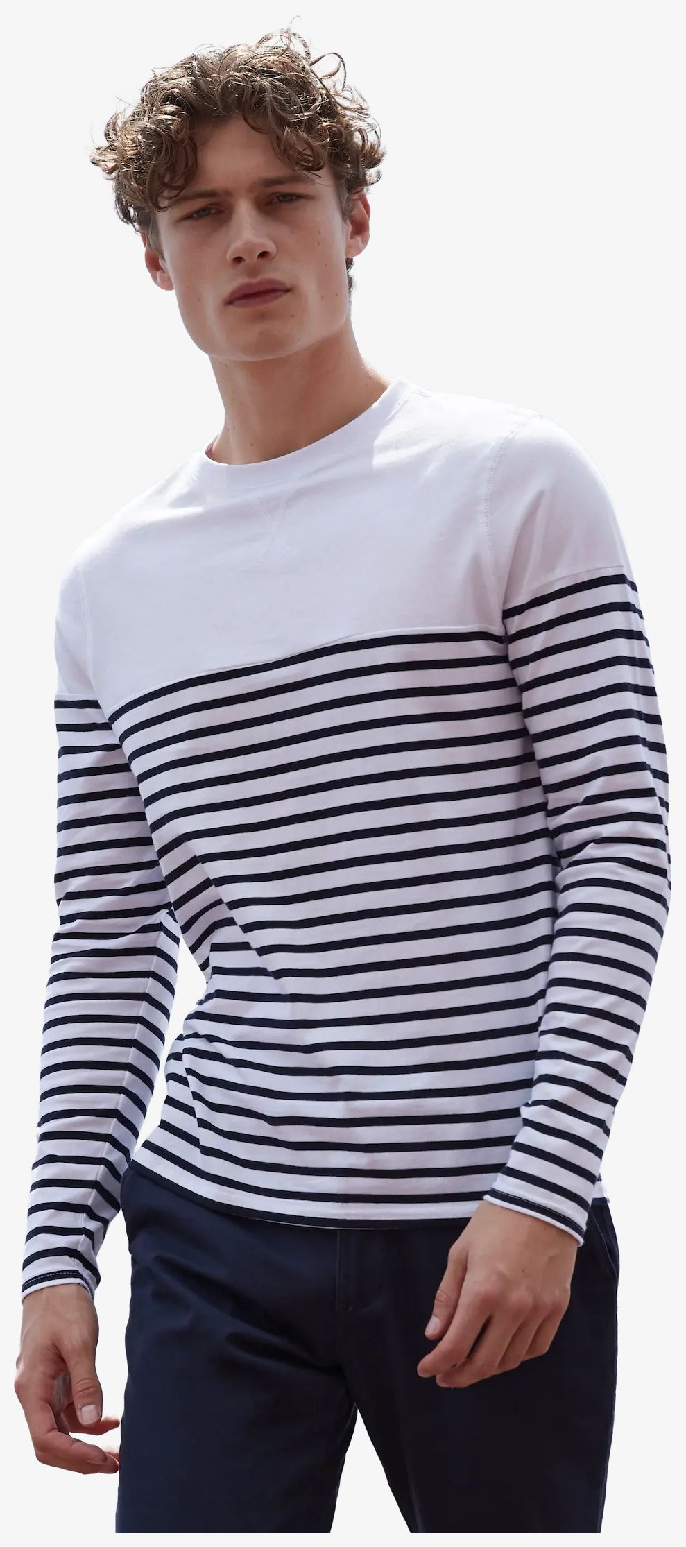 Tee-shirt z długim rękawem Breton wykonany jest z bawełnianej dzianiny jersey. Posiada elastyczny, prążkowany, okrągły kołnierz, płaskie szwy w kształcie litery V przy kołnierzu oraz podwójny ściągacz przy mankietach. Rękawy mają dolną część w paski oraz górną jednolitą.