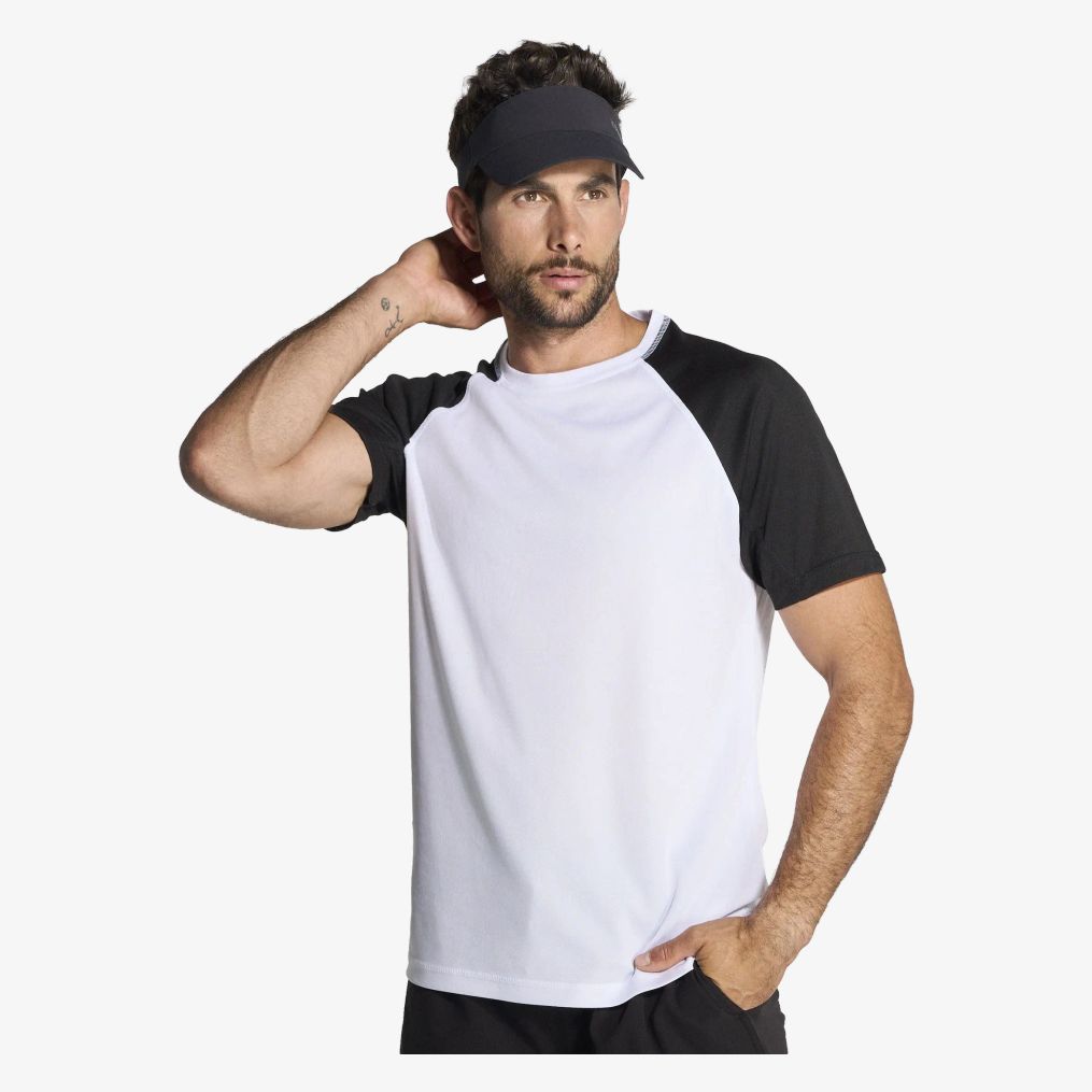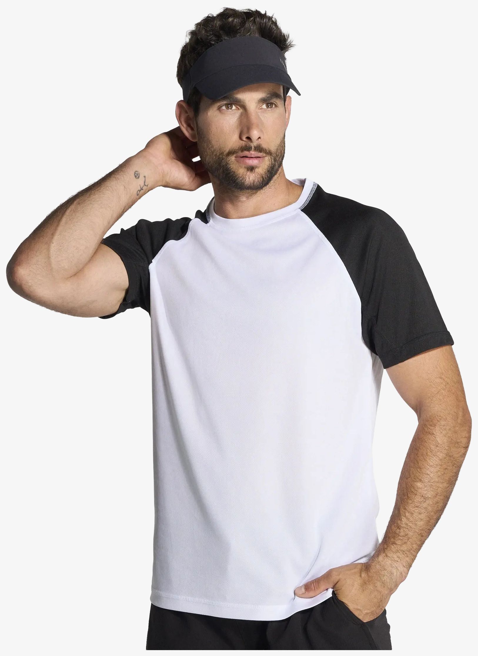 Sport contrast man to baseballowy tee-shirt z dzianiny pikowanej, zaprojektowany do użytku sportowego. Ma raglanowe kontrastowe rękawy oraz dekoracyjne szwy na rękawach. Skład to 100% poliester.