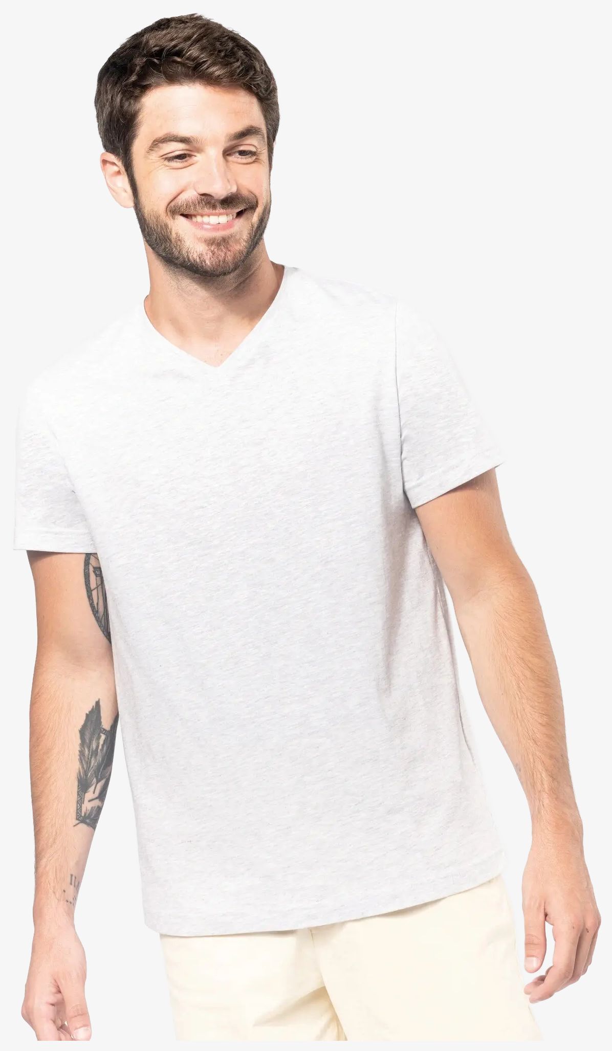 T-shirt col V manches courtes to tee-shirt o dopasowanym fasonie, z dekoltem w serek i krótkimi rękawami. Kontrastowa taśma wzmacniająca w kolorze szary melanż przy dekolcie (biała w kolorze białym). Wykończenie podwójnym ściegiem na dole rękawów i u dołu odzieży.