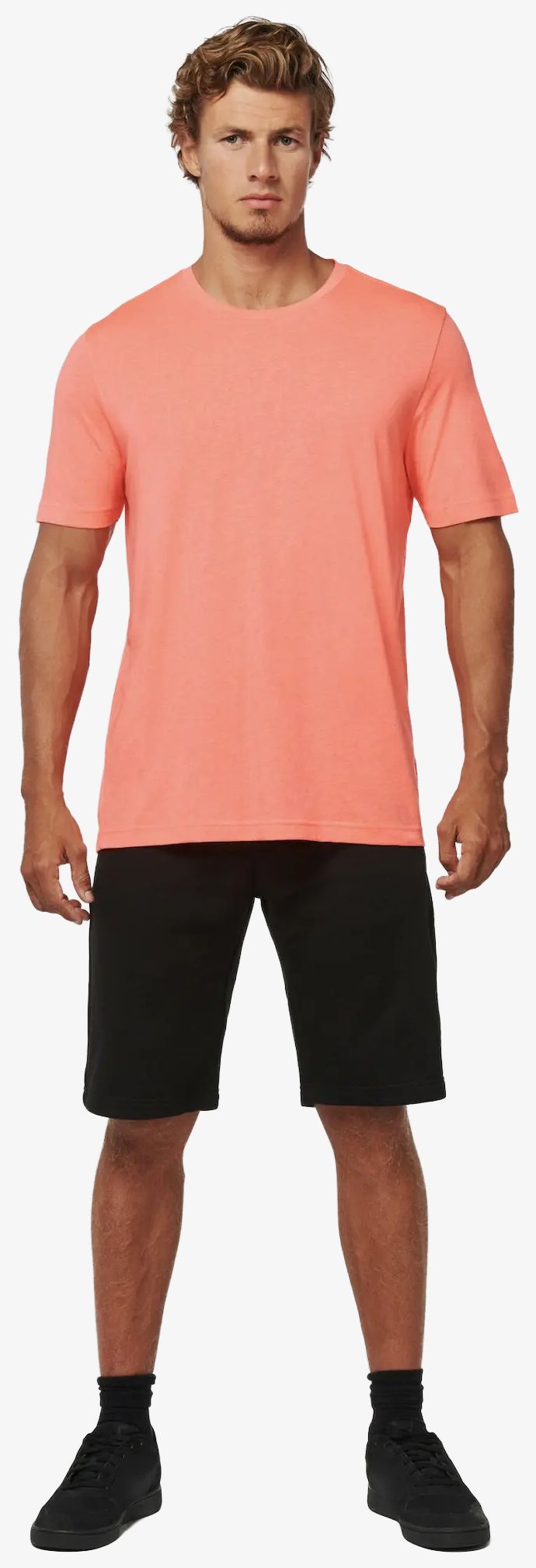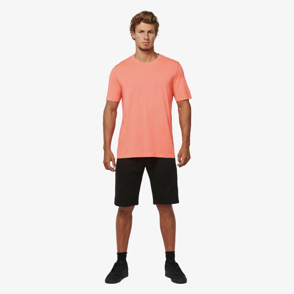 Męski sportowy tee-shirt triblend wykonany z dzianiny jersey z taśmą wzmacniającą przy kołnierzu w kolorze kołnierza oraz wykończeniem podwójnym ściegiem na końcach rękawów. Model nie posiada metki marki przy kołnierzu, jedynie wszywkę z rozmiarem.