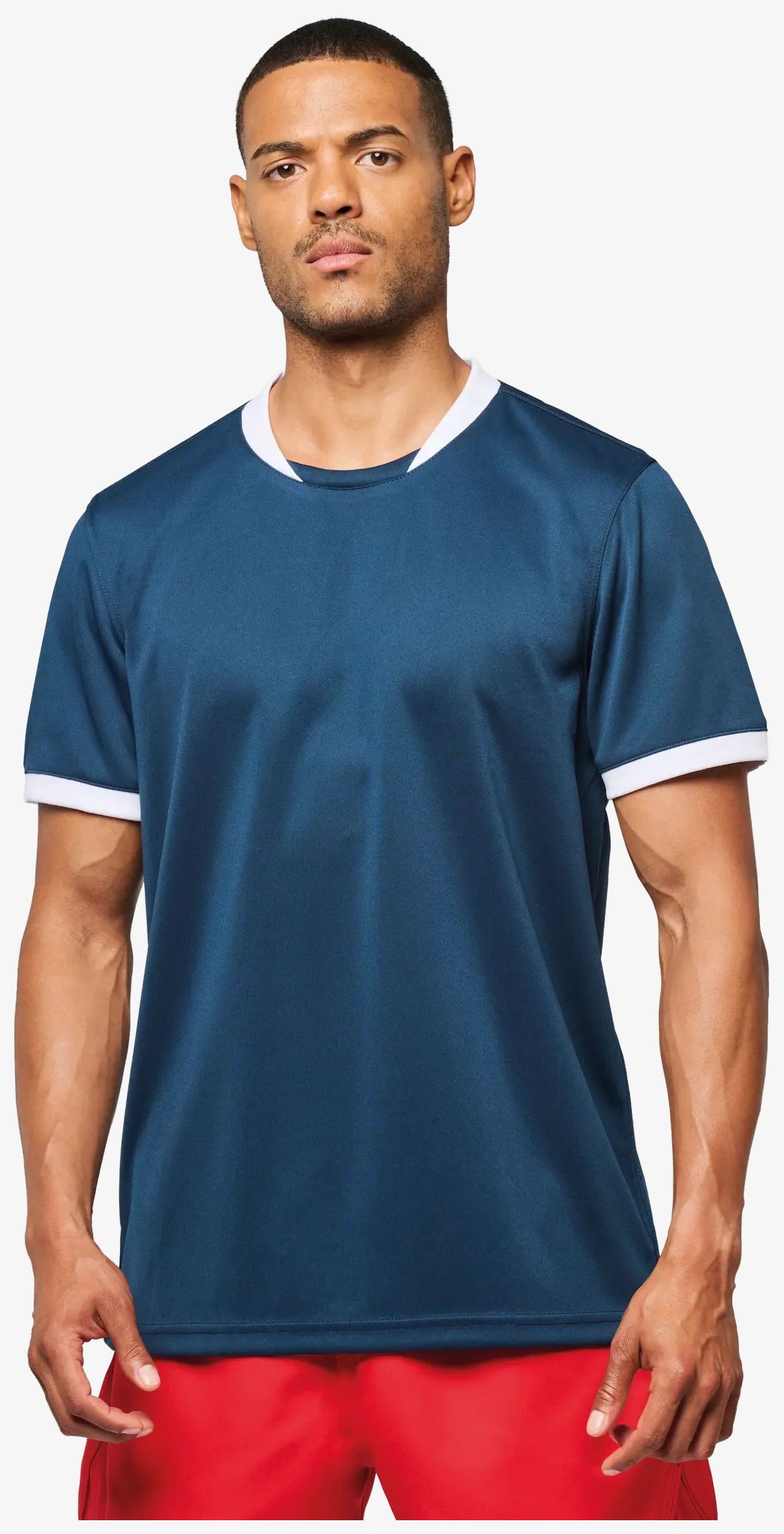 maillot rugby manches courtes unisexe wykonany jest z dzianiny interlock z prostym krojem i kontrastującym, prążkowanym okrągłym kołnierzem. Dolna część rękawów ma kontrastujące białe ściągacze. Pasek wzmacniający jest wykonany z ton w ton interlock. Szwy wzmocnione podwójną igłą w pachach, na ramionach i bokach.