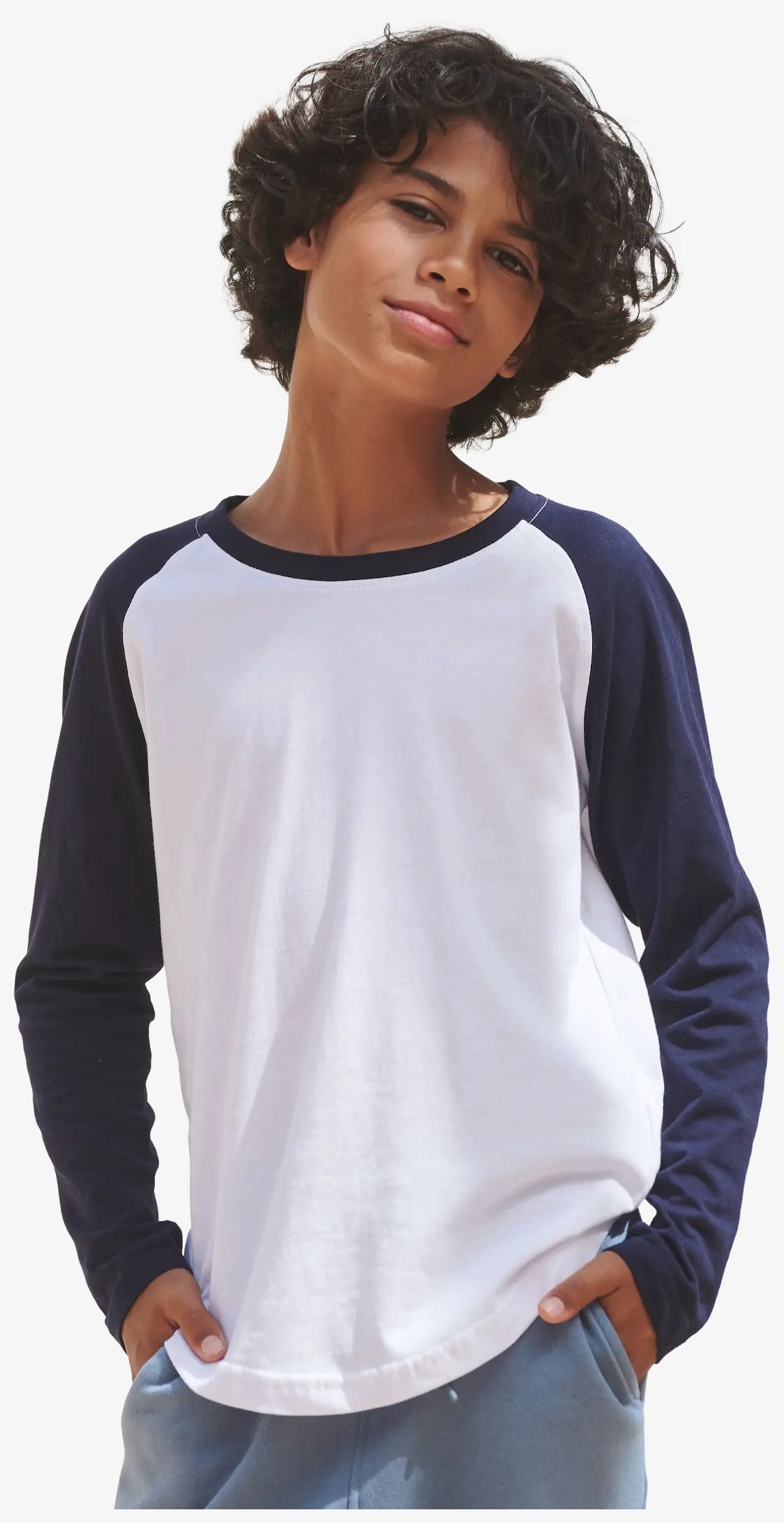 Dziecięcy long sleeve baseballowy tee-shirt posiada rękawy raglanowe i kontrastowy kołnierz. Zaokrąglony brzeg jest wzmocniony podwójnym szwem. Metka jest odpinana dla komfortu.