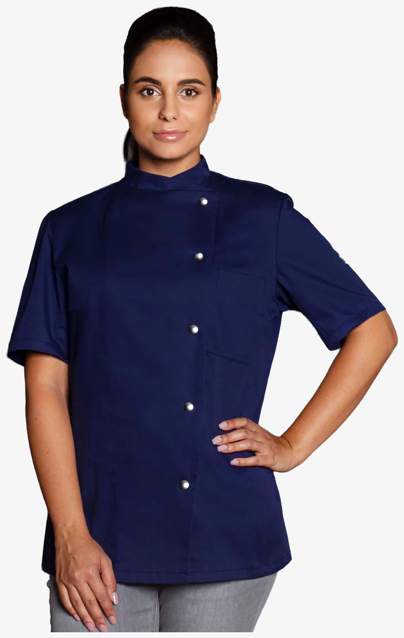 Damska kurtka kucharska Greta ma dopasowany krój z zaszewkami na piersi i cięciami princeskowymi z przodu i z tyłu. Posiada krótkie rękawy, kieszeń naszywaną po lewej stronie piersi oraz zapięcie na 5 zatrzasków.